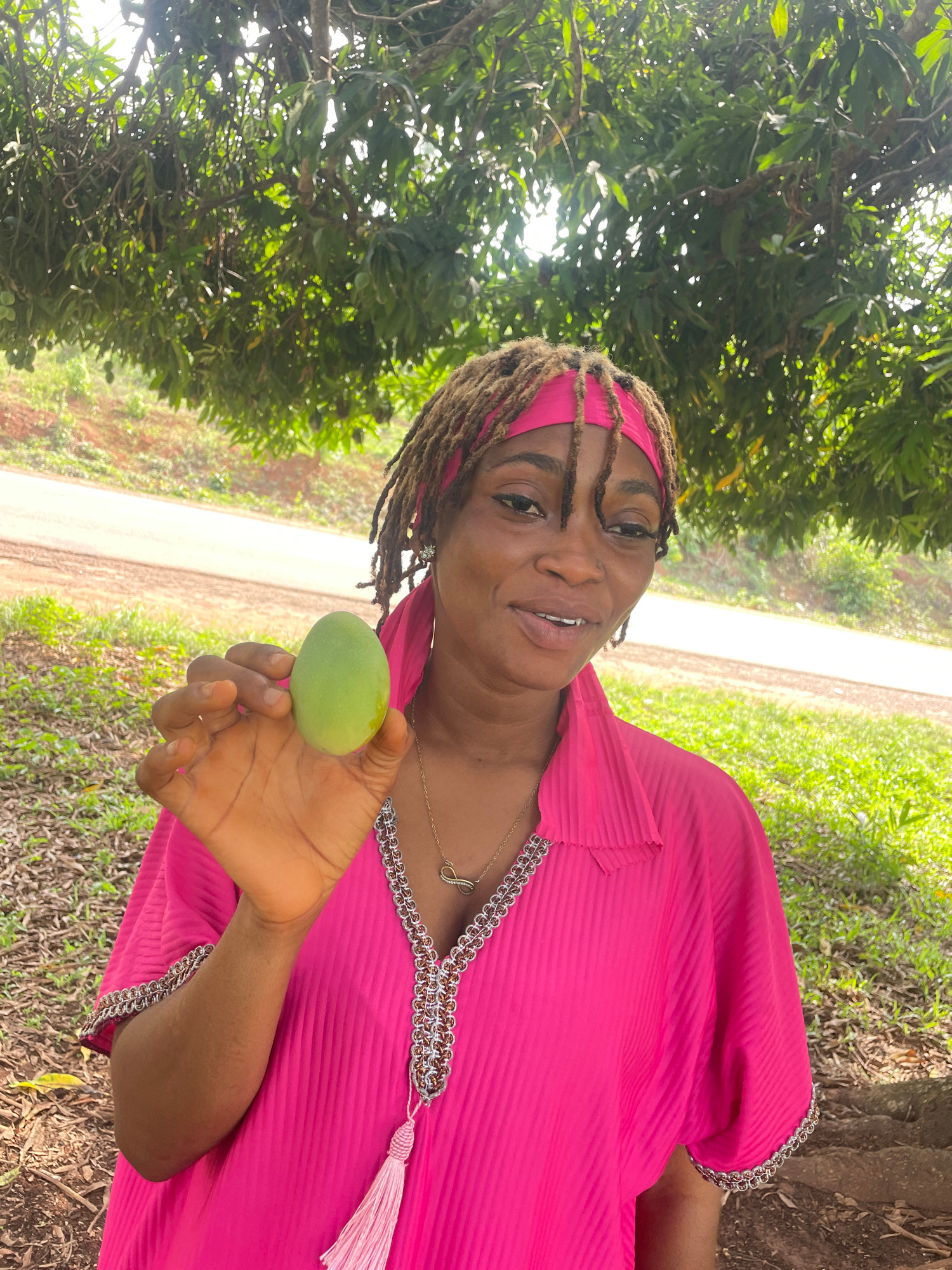 An adult woman with medium-dark skin is featured in an outdoor setting in Ogbe, Nigeria. She smiles pleasantly at the camera while holding a small, green, unripe mango in her left hand, presenting it…read more