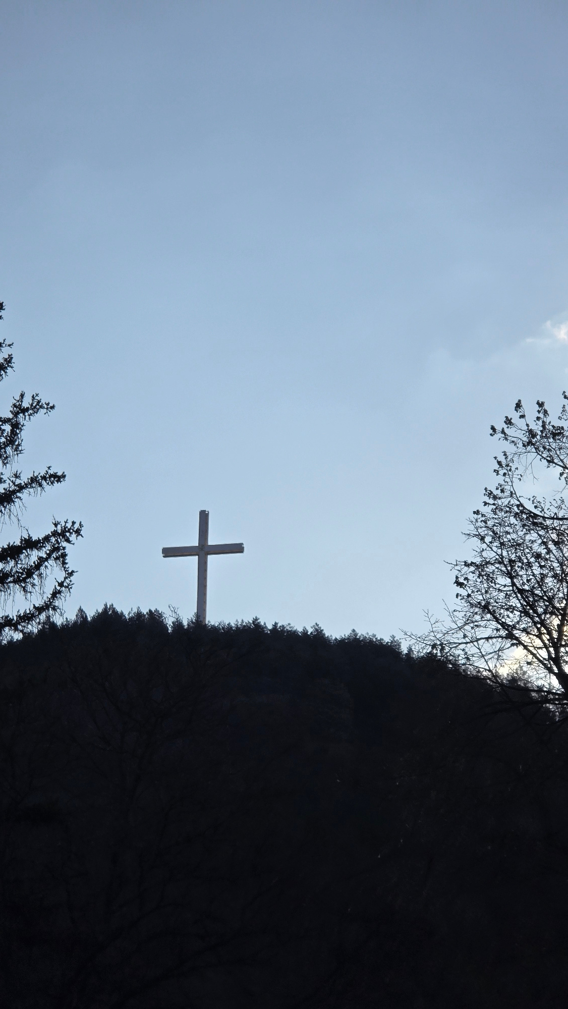 Looking up at a gray sky, a Christian cross appears to be situated on the side of a dark, tree-covered hill. Trees frame the image on top and bottom. The cross is the only distinct object in the shot.…read more