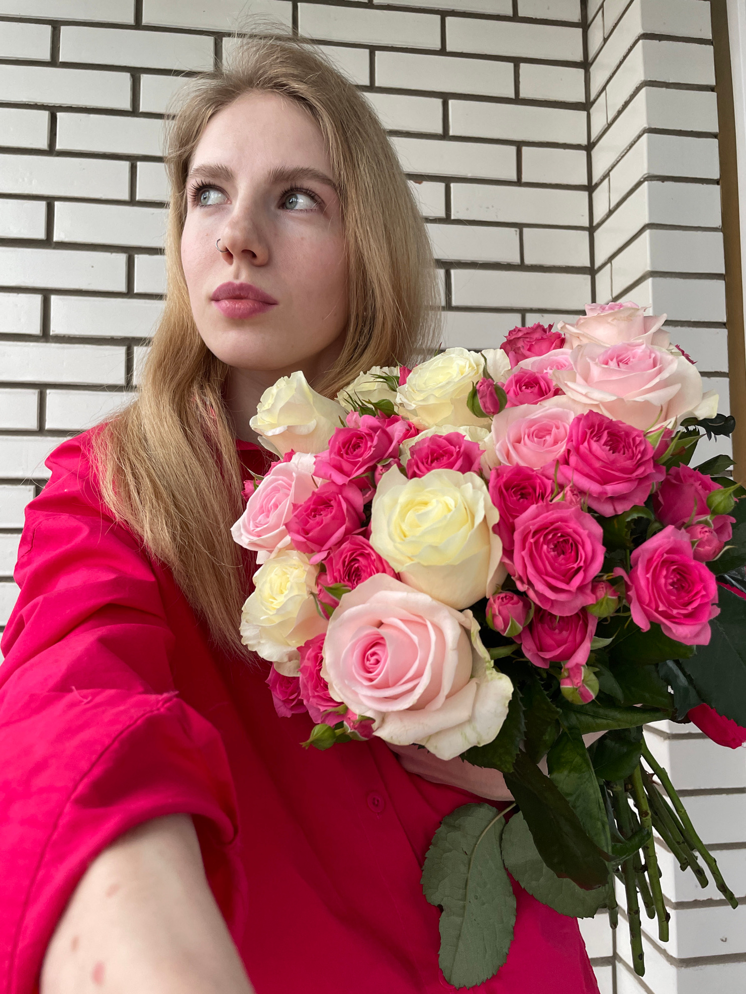 A young woman with light blonde hair and a nose ring is holding a large bouquet of roses in various shades of pink and white. She is wearing a bright pink shirt. The background appears to be a white b…read more