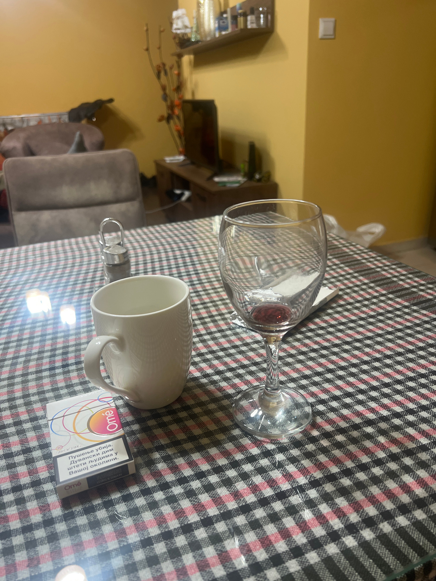 A checkered tablecloth covers a table in what appears to be a domestic indoor environment. A wine glass, a white mug, and a pack of Omé cigarettes rest on the tablecloth. The text on the cigarette pac…read more
