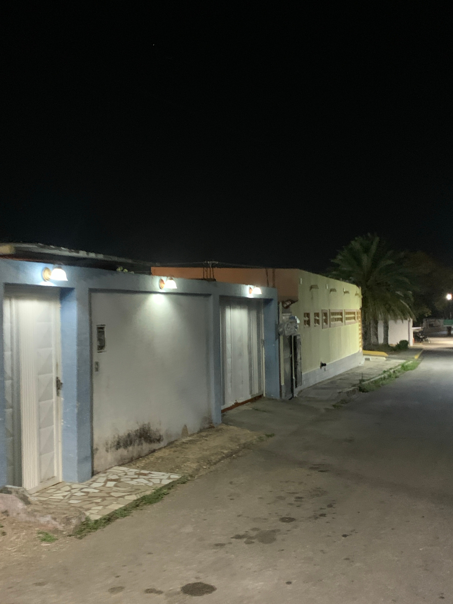 The image shows a street scene at night, likely in a residential area. The perspective is tilted. On the right is a paved street with some stains or patches. To the left of the street is a building fa…read more