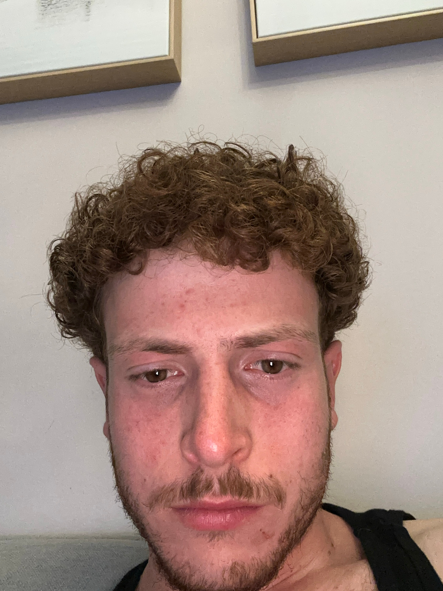 The image shows a close-up of a man's face with curly brown hair, brown eyes, and a light beard. The background is a light-colored wall with two framed artworks visible on the left side. The man is we…read more