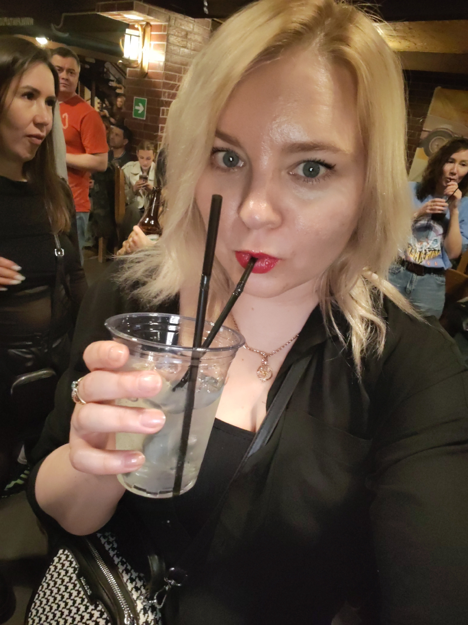The image captures a blonde woman with blue eyes and red lipstick, looking directly at the camera, likely in a selfie or posed photograph. She is wearing a black top, a delicate necklace with a pendanβ¦read more