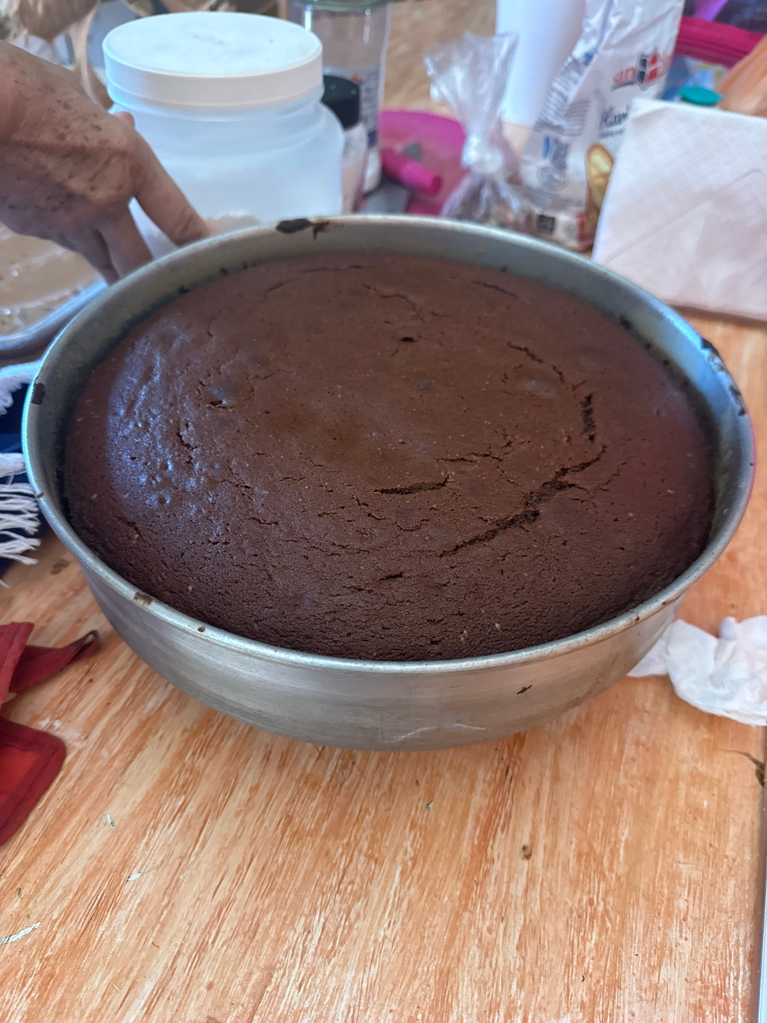 A freshly baked, round, dark chocolate cake is presented in a silver metal baking pan on a light brown wooden surface. The cake has a slightly cracked top. To the left, out of focus, are various unide…read more