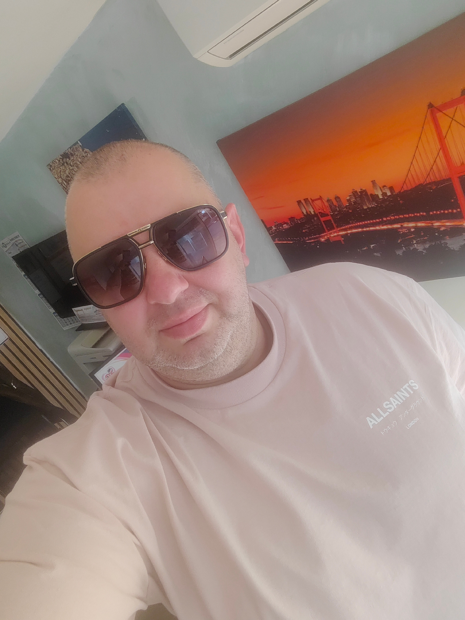 A selfie photograph shows a man wearing sunglasses and a pink t-shirt with the logo "ALLSAINTS" and Japanese text below. The background includes a cityscape print with a bridge, potentially the Bospho…read more