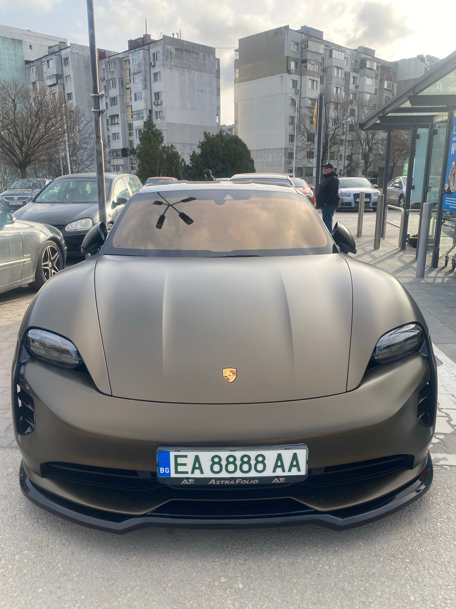 The image shows a matte-grey Porsche Taycan parked in an urban area. The car has a Bulgarian license plate reading "EA 8888 AA". The hood displays the Porsche logo, and the front of the car is angledβ¦read more