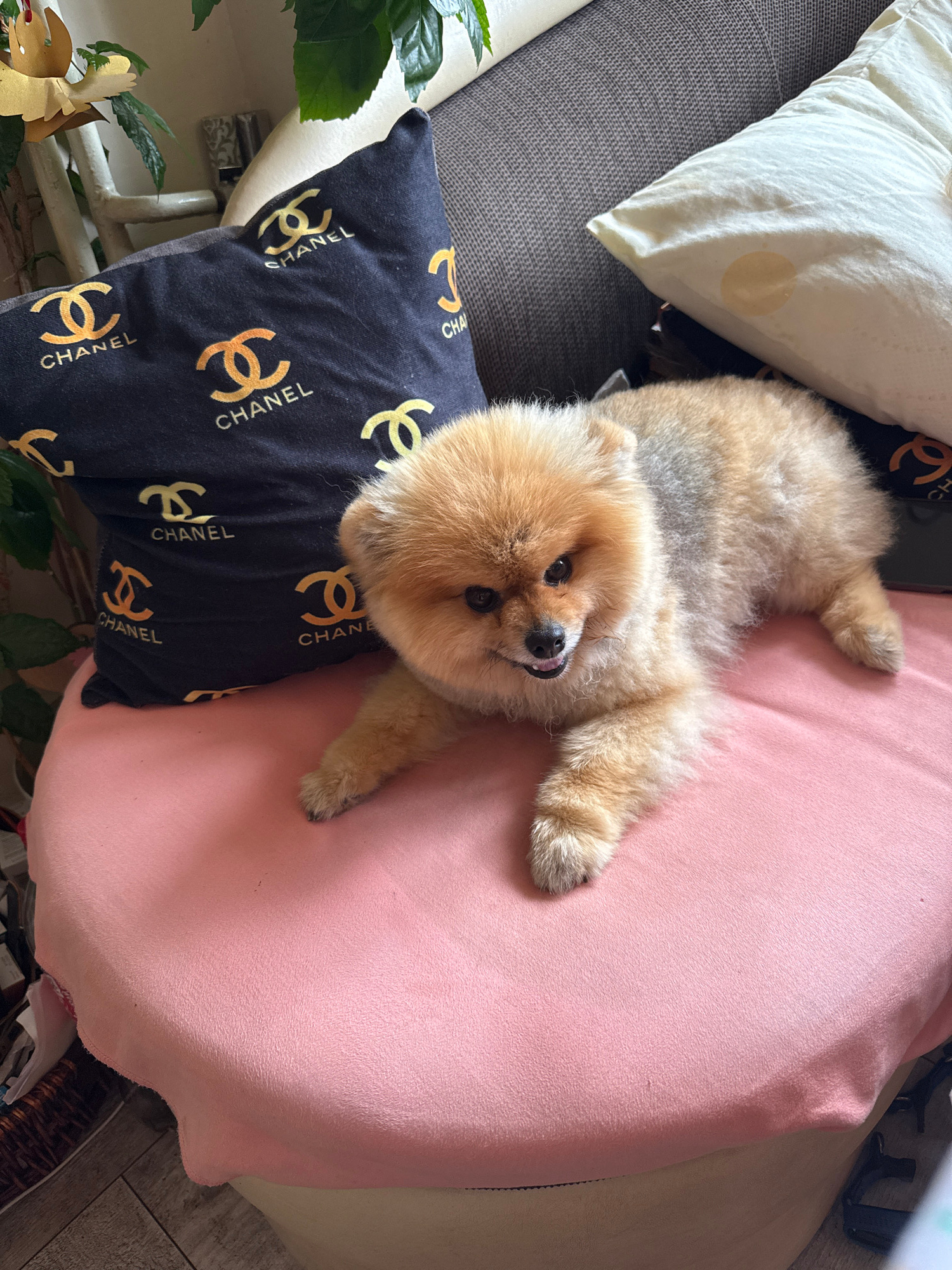 A Pomeranian dog lies on its back on a pink pillow, next to a black Chanel-patterned pillow and a white pillow. The dog's paws are outstretched, and it is looking upwards. The scene appears to be indo…read more