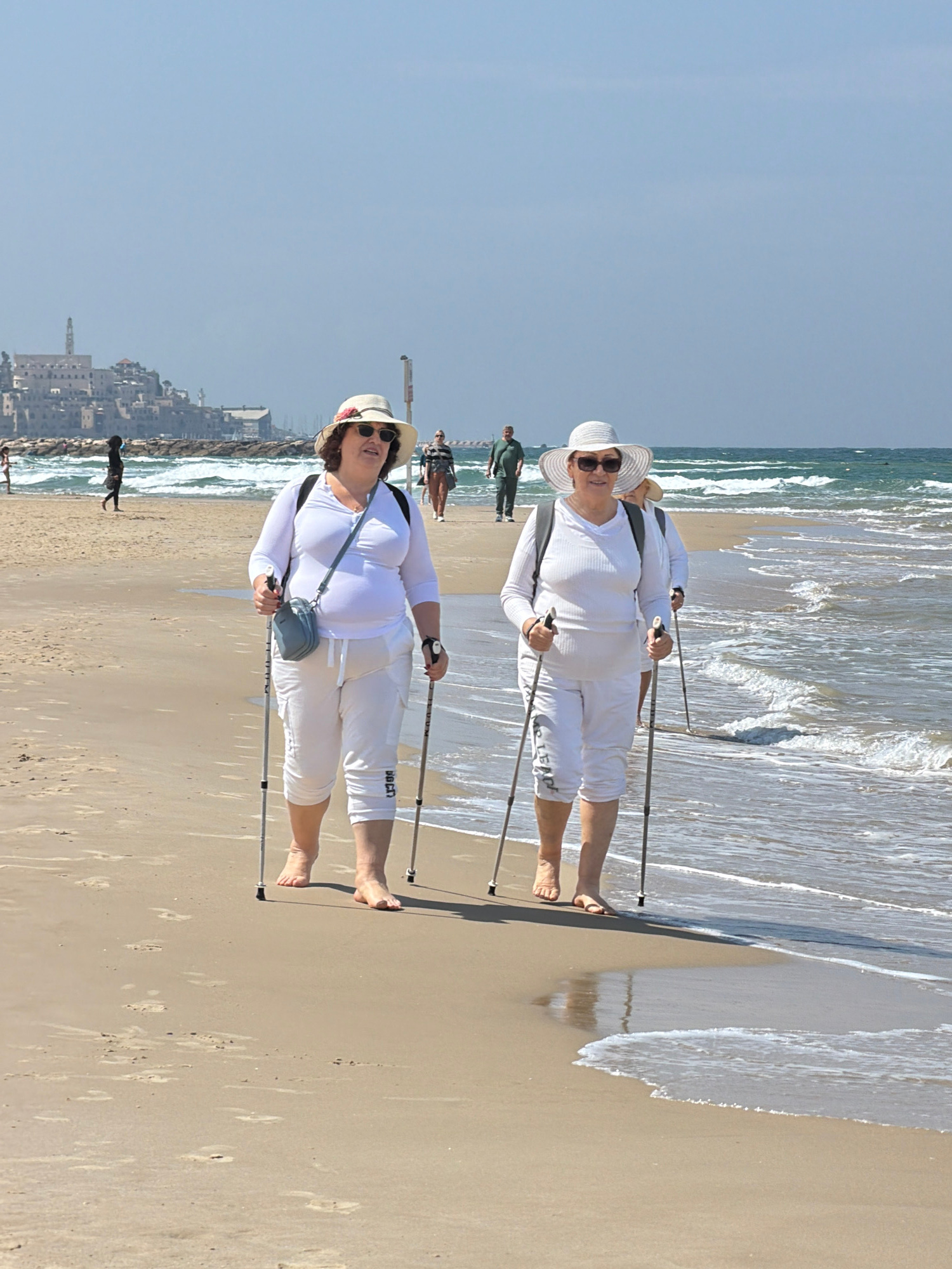 Two elderly women are walking on a beach in Tel Aviv, Israel, each using Nordic walking poles. They are dressed in white clothing and hats. A distant view of the city's skyline, including buildings an…read more