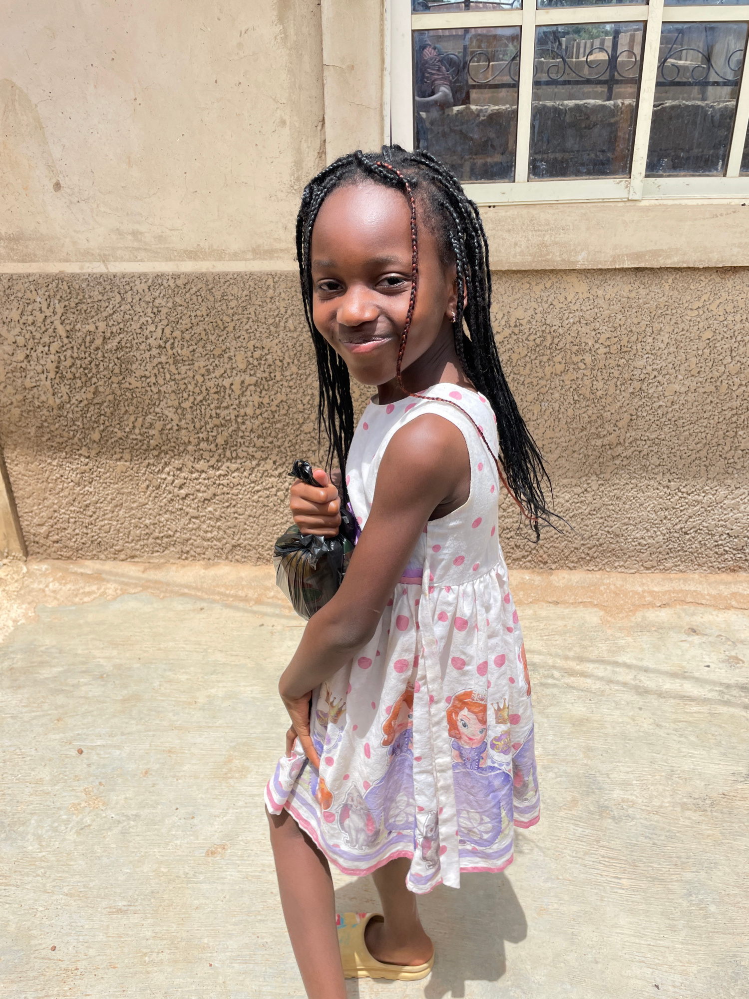 A young African girl stands outdoors near a light-colored wall and window. She has braided hair and wears a white dress with pink polka dots and a purple, cartoon character-themed trim. She holds a bl…read more