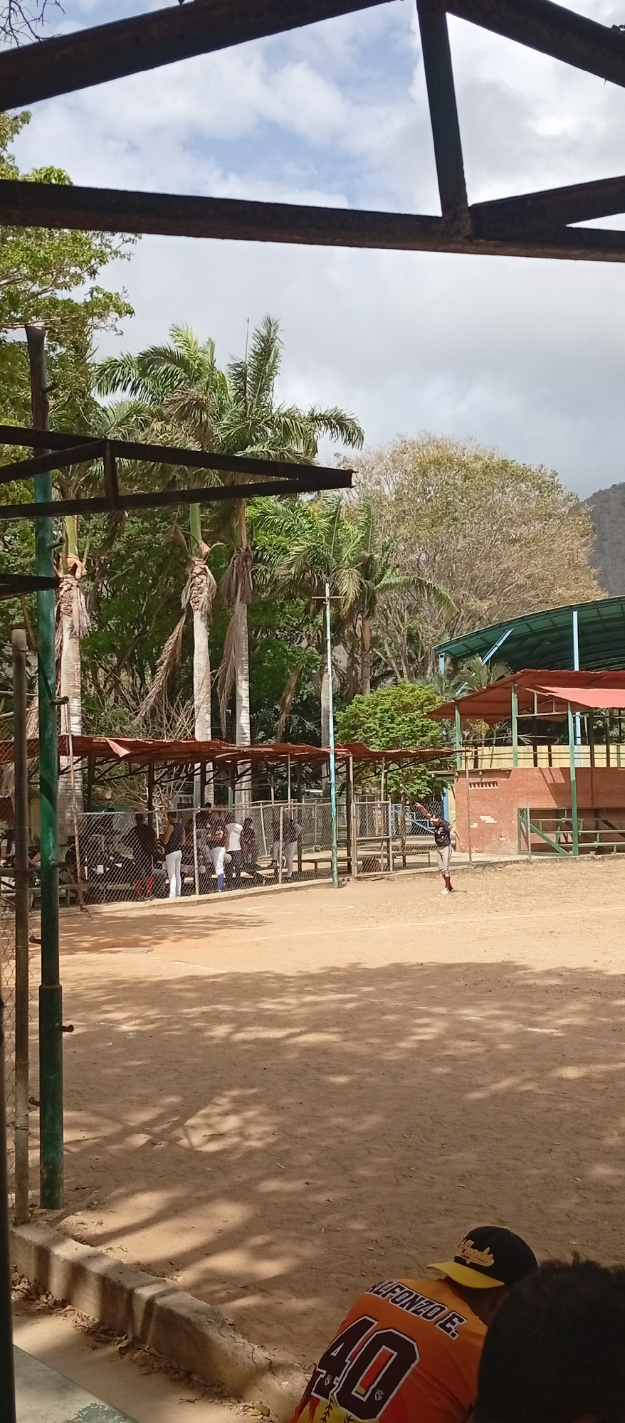 This is a daytime photograph taken at a baseball field in Las Piedras, Venezuela. A baseball game is in progress on a dirt field. One player is in the pitcher's mound, preparing to throw the ball. Othβ¦read more