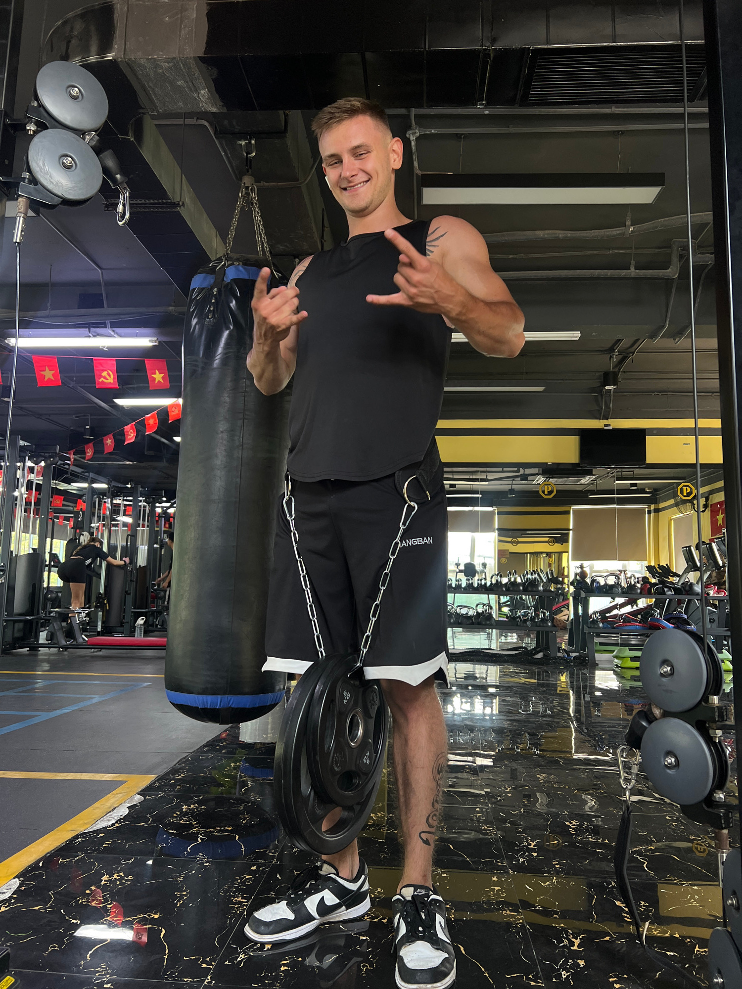 A man stands in a gym in Nam Nha Trang, Vietnam. He wears a black t-shirt, black shorts with white trim, and black and white athletic shoes. He has a tattoo on his upper arm and lower leg. He is smili…read more