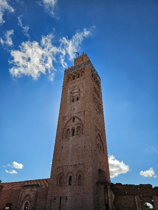 A tall, brown brick tower is seen angled upward against a bright blue sky with scattered white clouds. The tower features decorative arches and patterns along its height. The top of the tower has intrβ¦read more