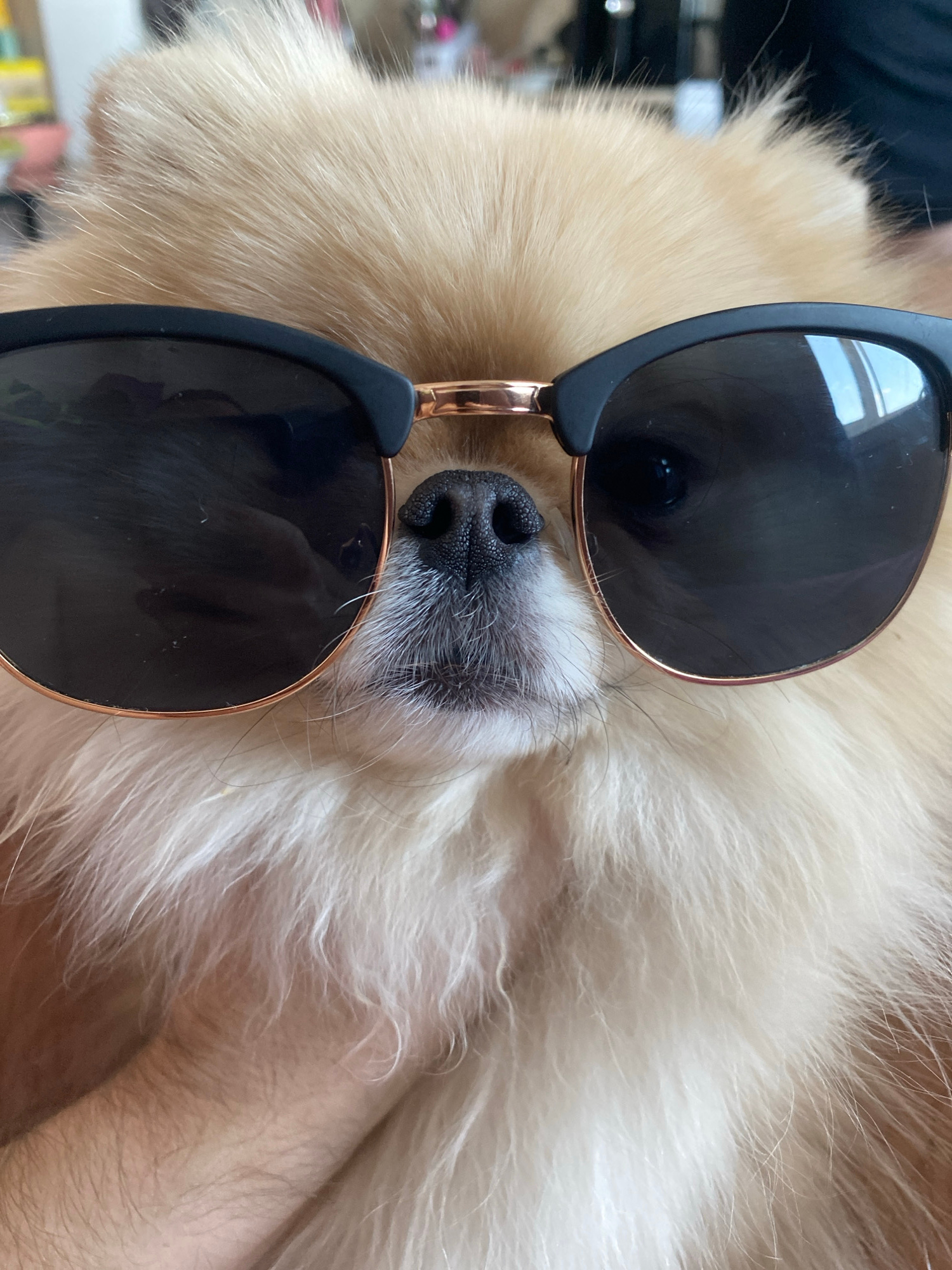 A close-up, portrait-oriented shot features a small dog, likely a Pomeranian, wearing sunglasses. The dog has light brown and white fluffy fur. Its dark, moist nose and part of its snout are visible bβ¦read more