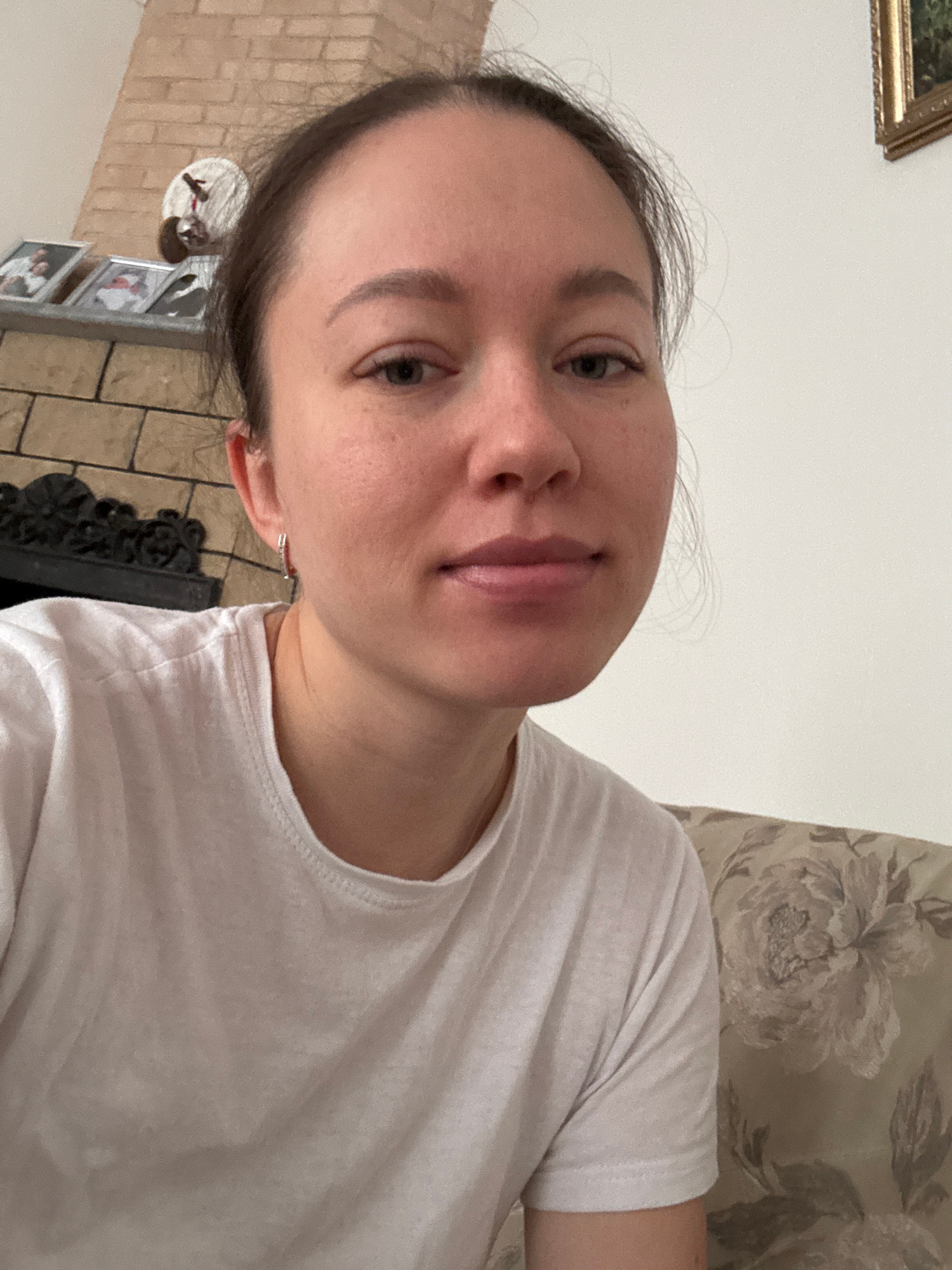 A young woman with brown hair pulled back is wearing a white t-shirt. She is indoors, with a floral pattern pillow behind her to the right, and a brick wall with a fireplace and framed photos to the l…read more