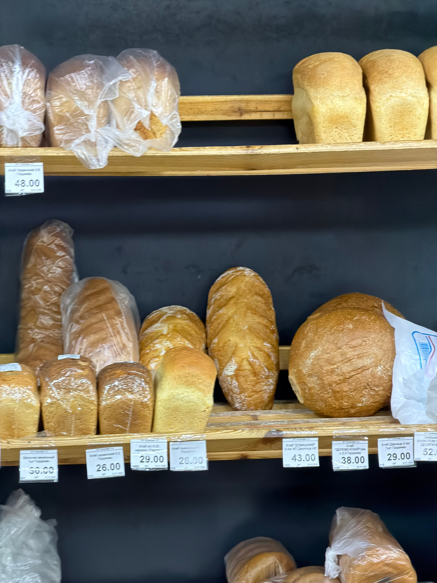 The image shows a shelf of bread loaves in a store, likely a bakery or grocery store. The loaves are of various shapes and sizes, some wrapped in clear plastic. Prices in Russian rubles are displayed…read more