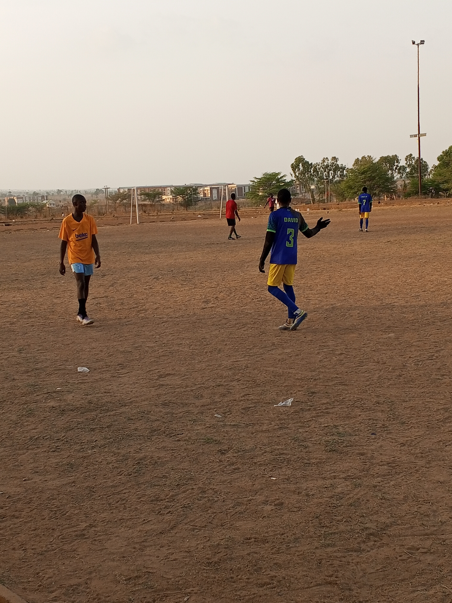The image shows a group of people playing soccer on a dirt field in Minna, Nigeria. A person in an orange jersey with the word "Beko" is walking on the left side. In the center, another person wearing…read more