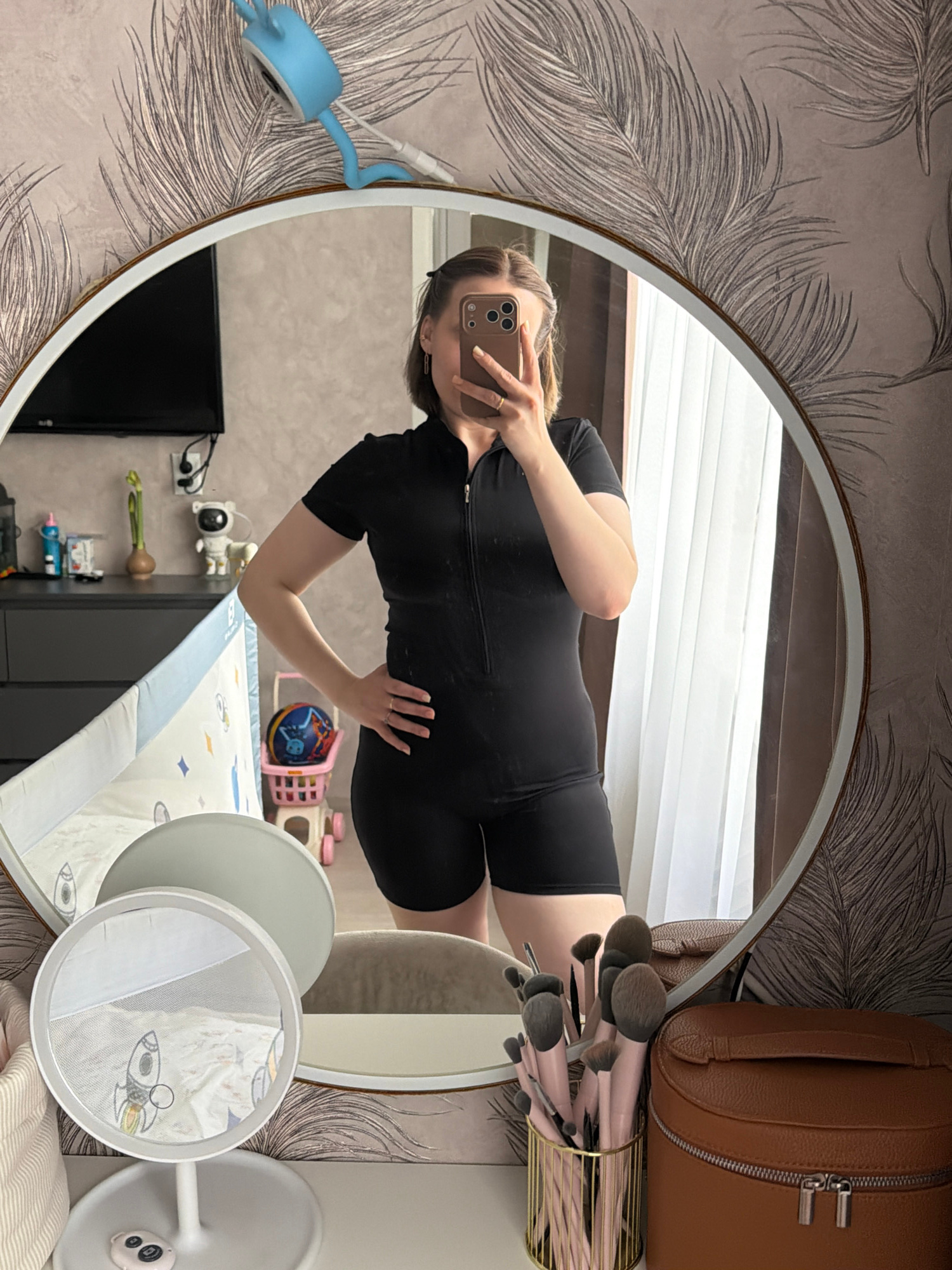 A young woman is captured in a mirror selfie, standing in what appears to be a bedroom or nursery in Reshetnikovo, Russia. The image is presented sideways, with the room's features reflected in a larg…read more