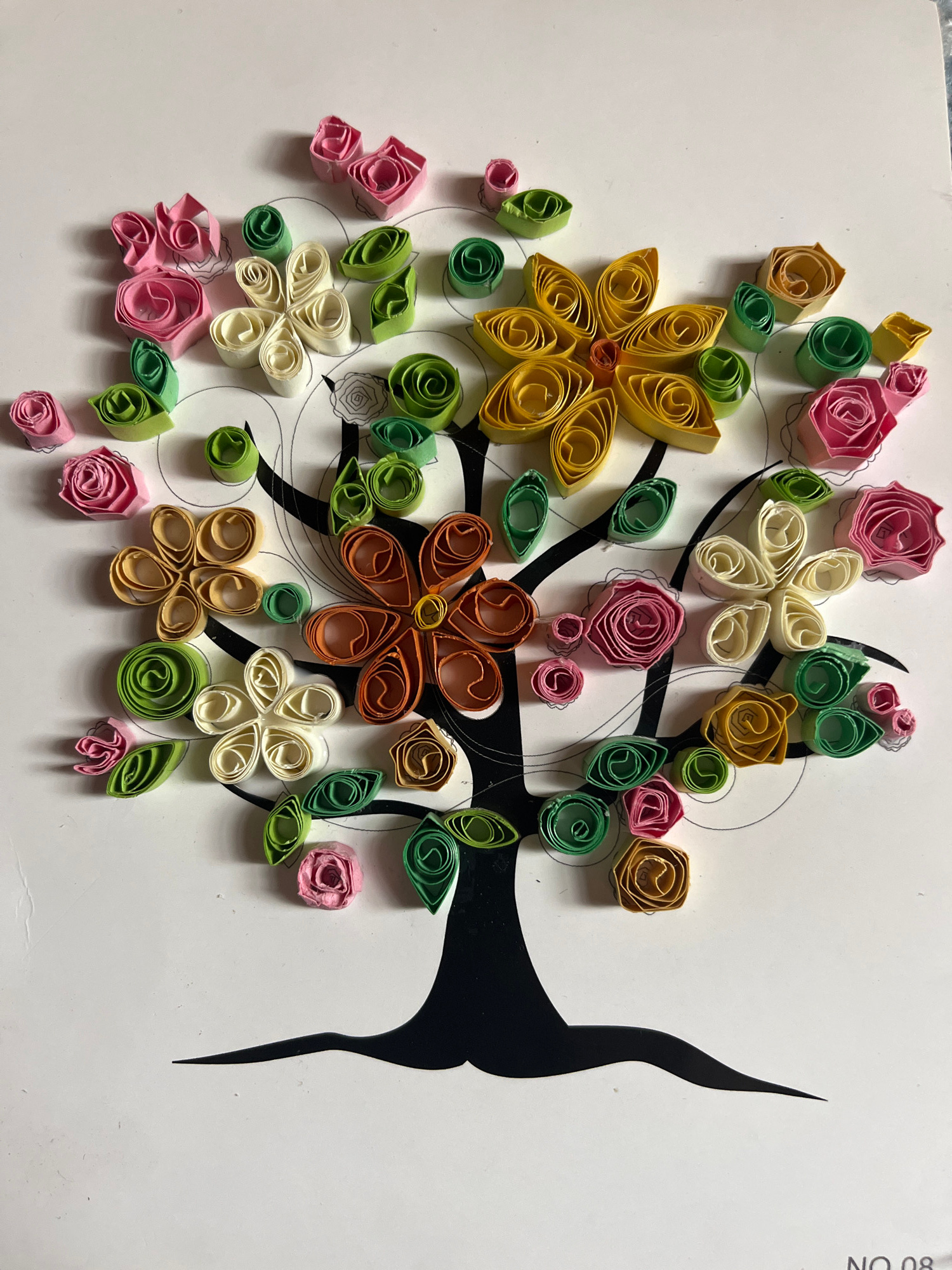 The image shows a paper quilling artwork on a white background. The artwork depicts a stylized tree with a black trunk and branches. The tree's crown is formed by numerous colorful paper quilled floweβ¦read more
