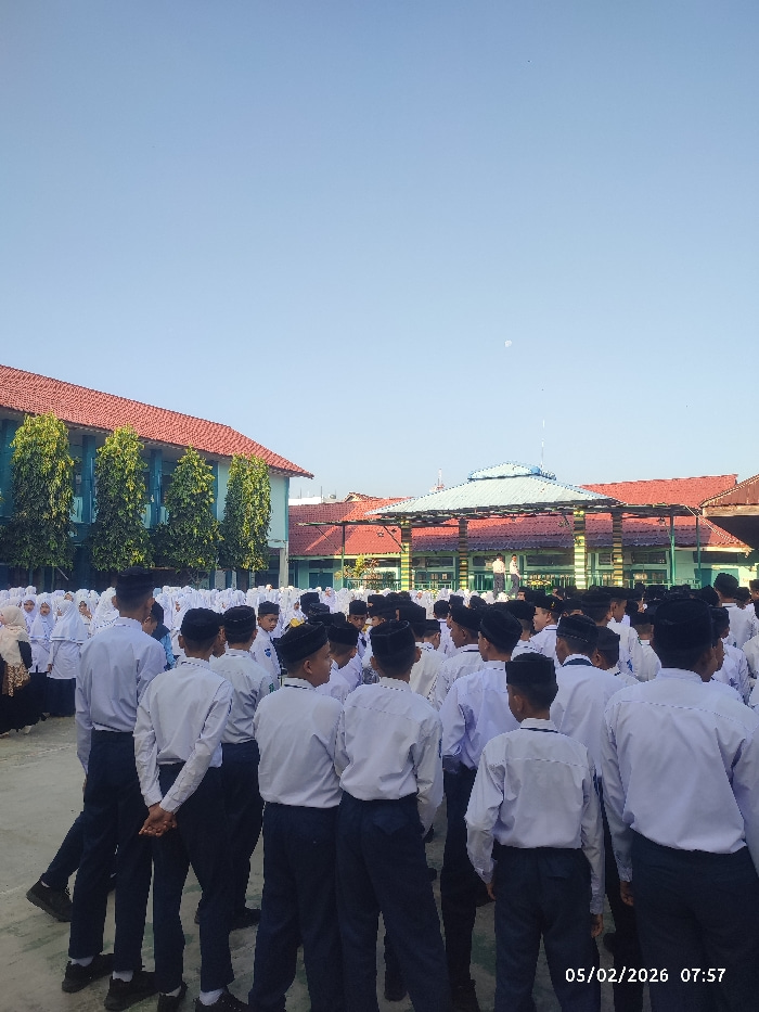 A large group of students in matching uniforms are standing in a schoolyard. They wear white shirts and dark pants. In the background, there are buildings with red tile roofs and green trim. The stude…read more