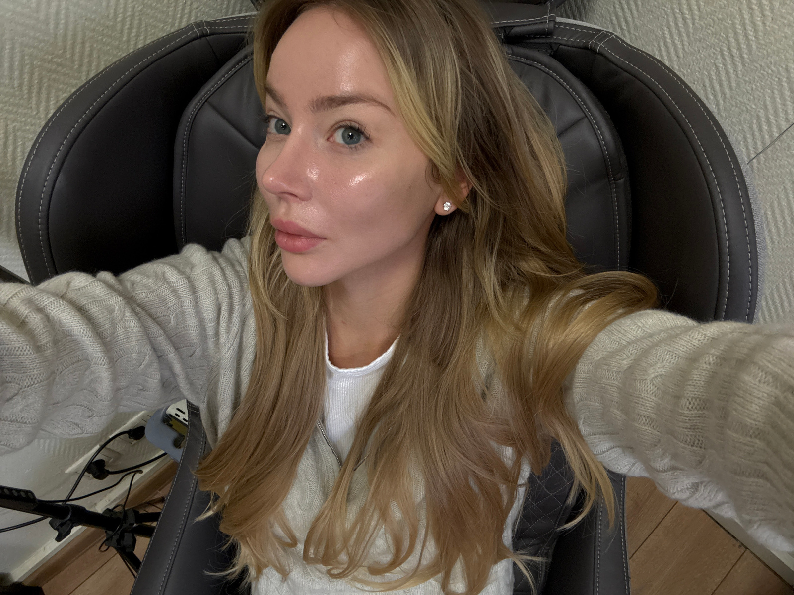 A woman with light skin, blonde hair, and blue eyes is lying in a gray chair. She is wearing a white shirt under a light gray sweater with a textured pattern. The chair is dark gray with light gray st…read more