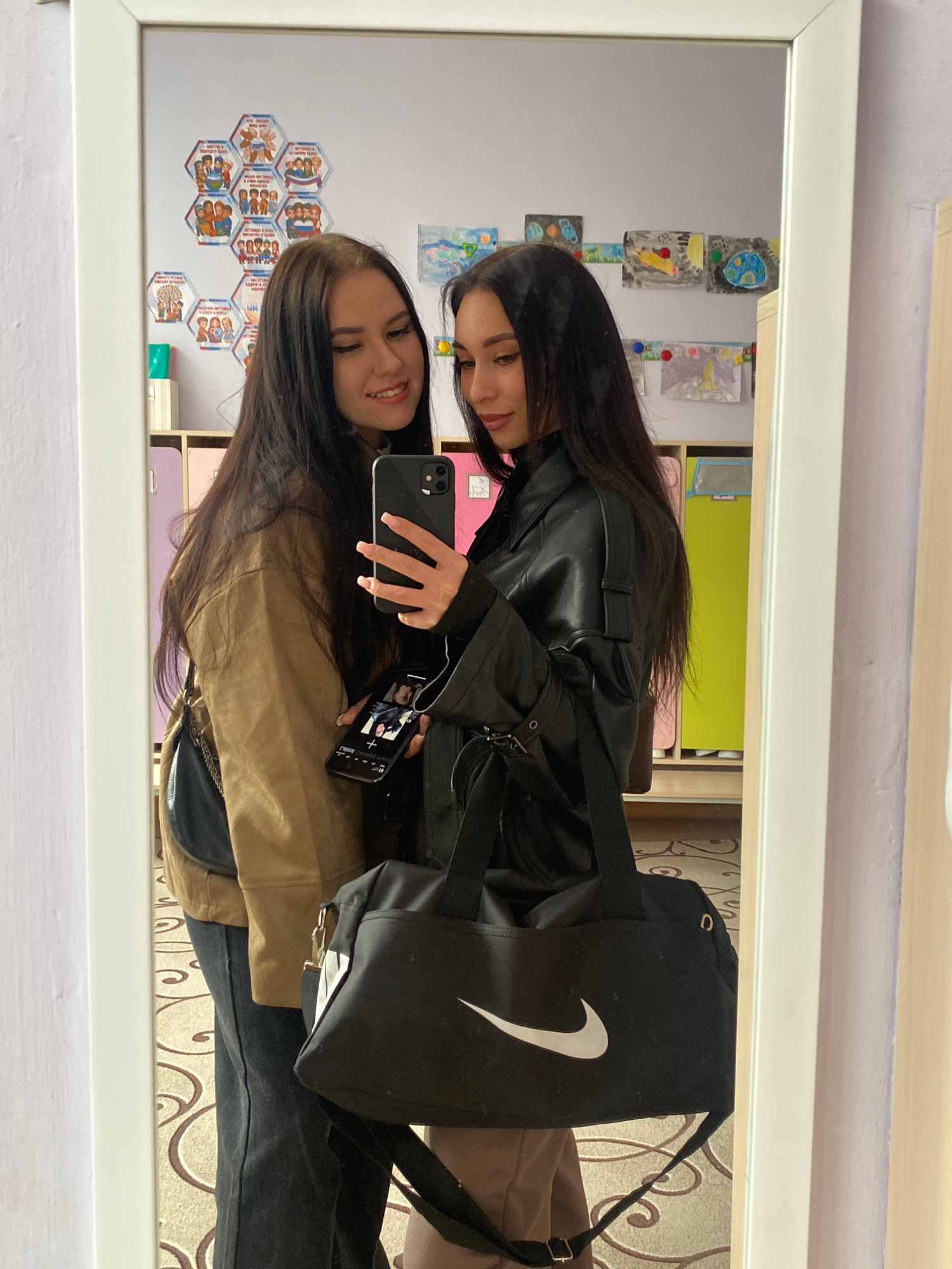 The image displays two young women reflected in a large mirror, posing for a photograph in an indoor setting. Both women have long, dark hair and are smiling, indicating a cheerful mood. The woman in…read more