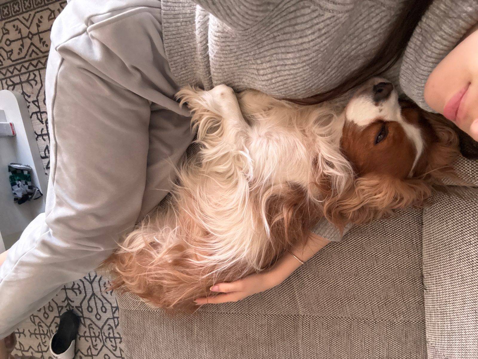 A woman is lying on a grey couch with a Cavalier King Charles Spaniel dog resting on her chest and legs. The woman is wearing a grey sweater and grey sweatpants. Her lips are visible in the lower left…read more