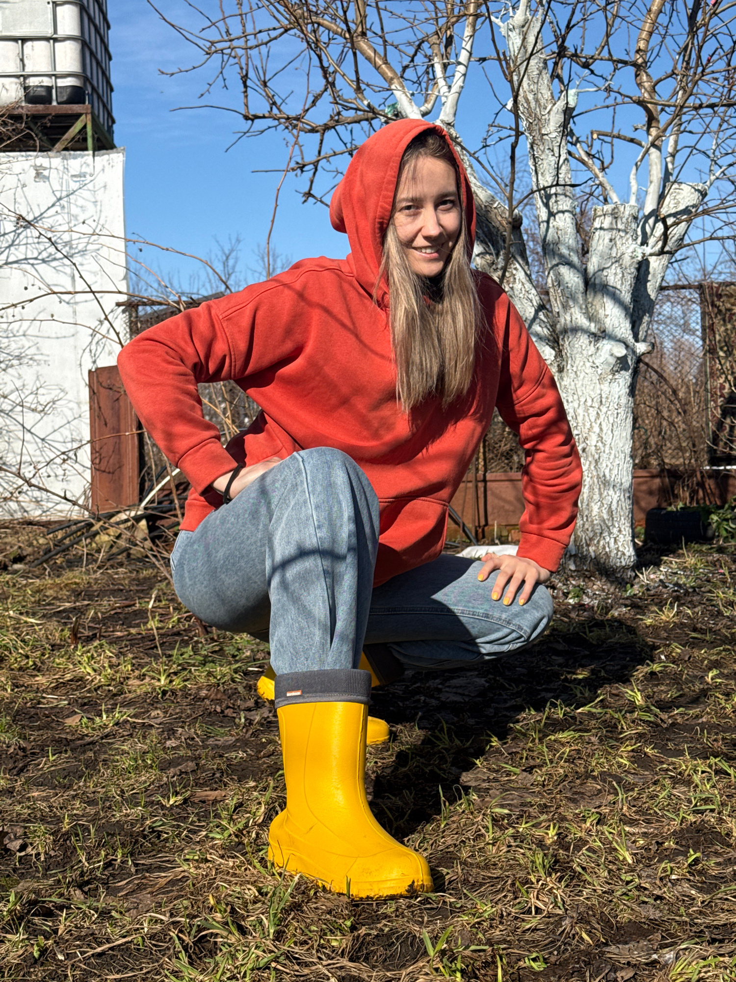 A young woman is kneeling outdoors on soil covered with sparse grass, wearing an orange hooded sweatshirt, blue jeans, and bright yellow rubber boots. She is smiling and looking at the camera. Behind…read more