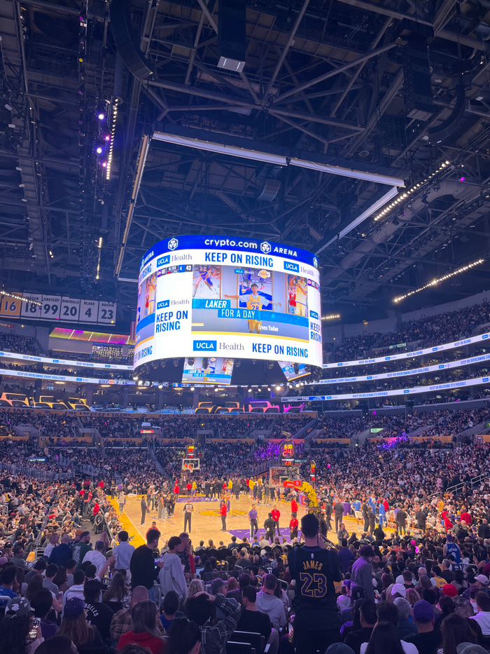 A basketball game at Crypto.com Arena with many spectators in attendance. A large, digital scoreboard hangs overhead displaying game information, advertisements, and the phrase "KEEP ON RISING." In th…read more