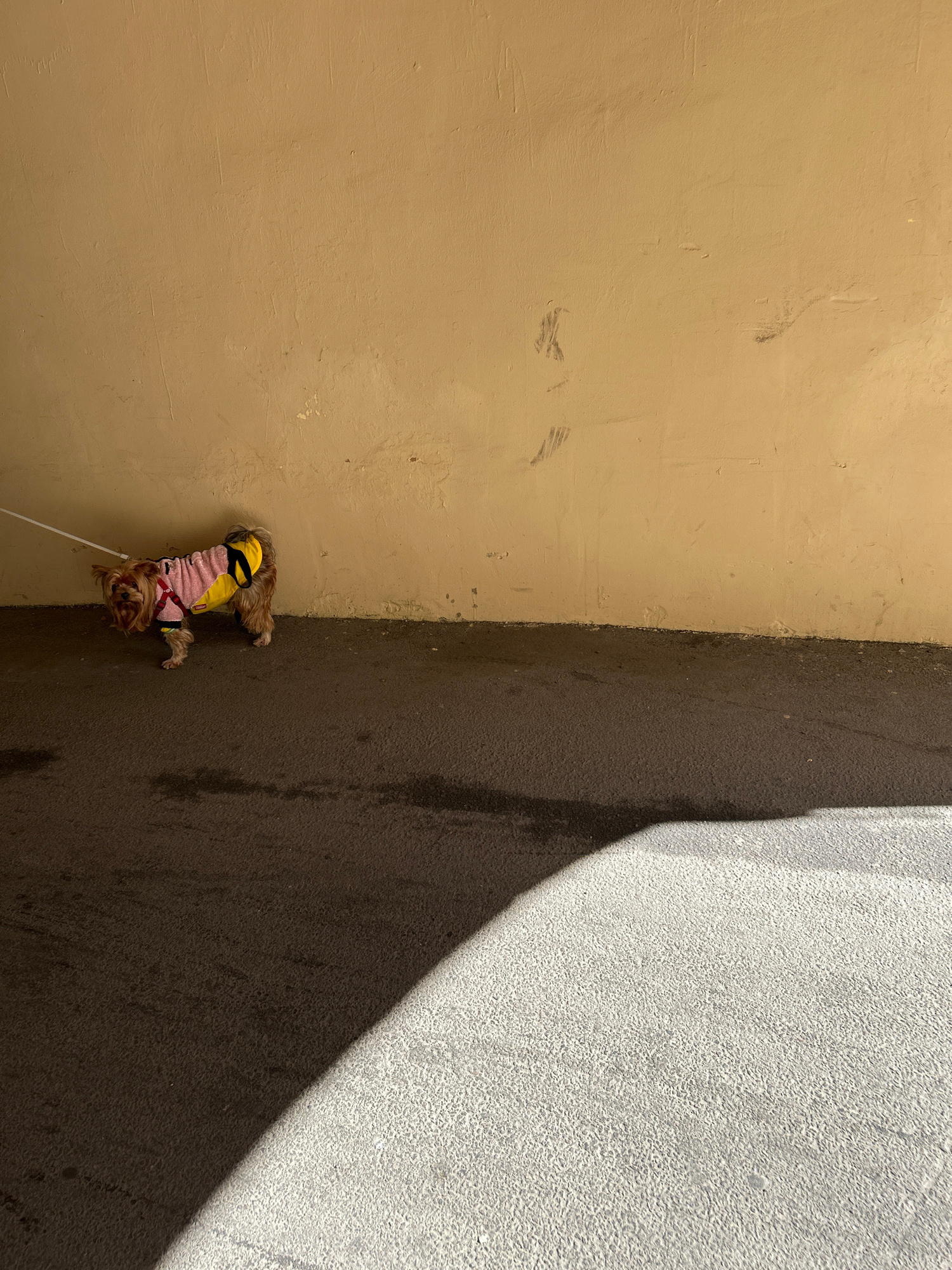 A high-angle outdoor shot depicts a small dog, possibly a Yorkshire Terrier, positioned at the corner of a textured tan wall and a dark asphalt-like ground. The dog is wearing a multi-colored garment,…read more