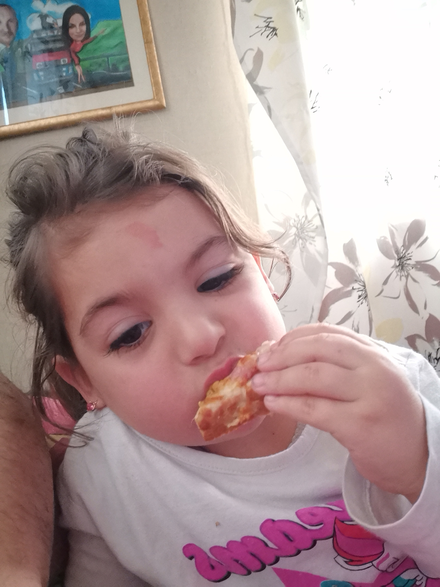 A young girl with brown hair eats pizza. She is wearing a white long-sleeve shirt with a pink design. The background includes a wall with a framed picture and a patterned curtain. The location is like…read more