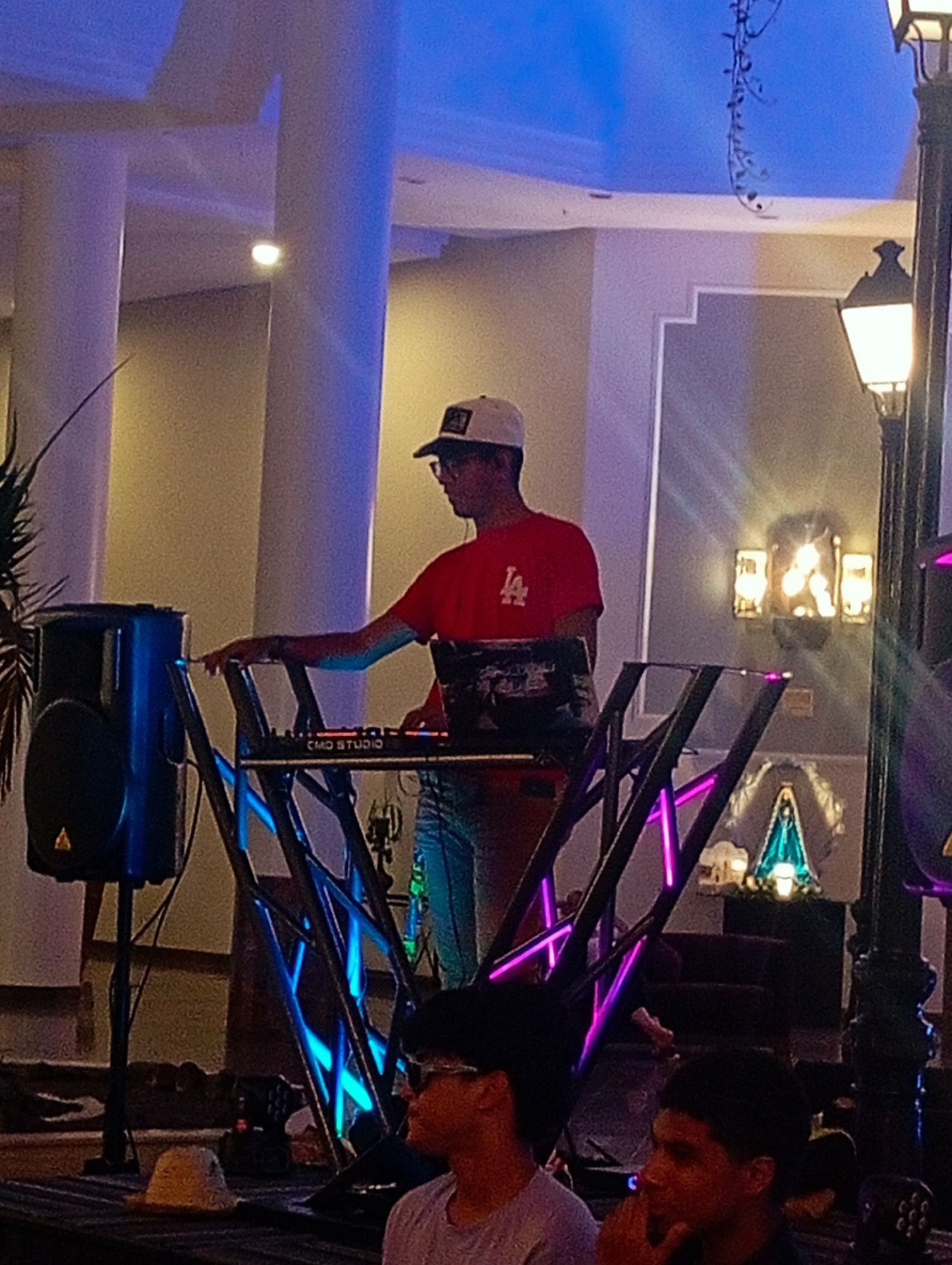 The image shows a DJ performing at an event, likely a party or gathering. The DJ, wearing a red t-shirt with an "LA" logo, a baseball cap, and glasses, is operating a "CMD Studio" mixing console on a…read more