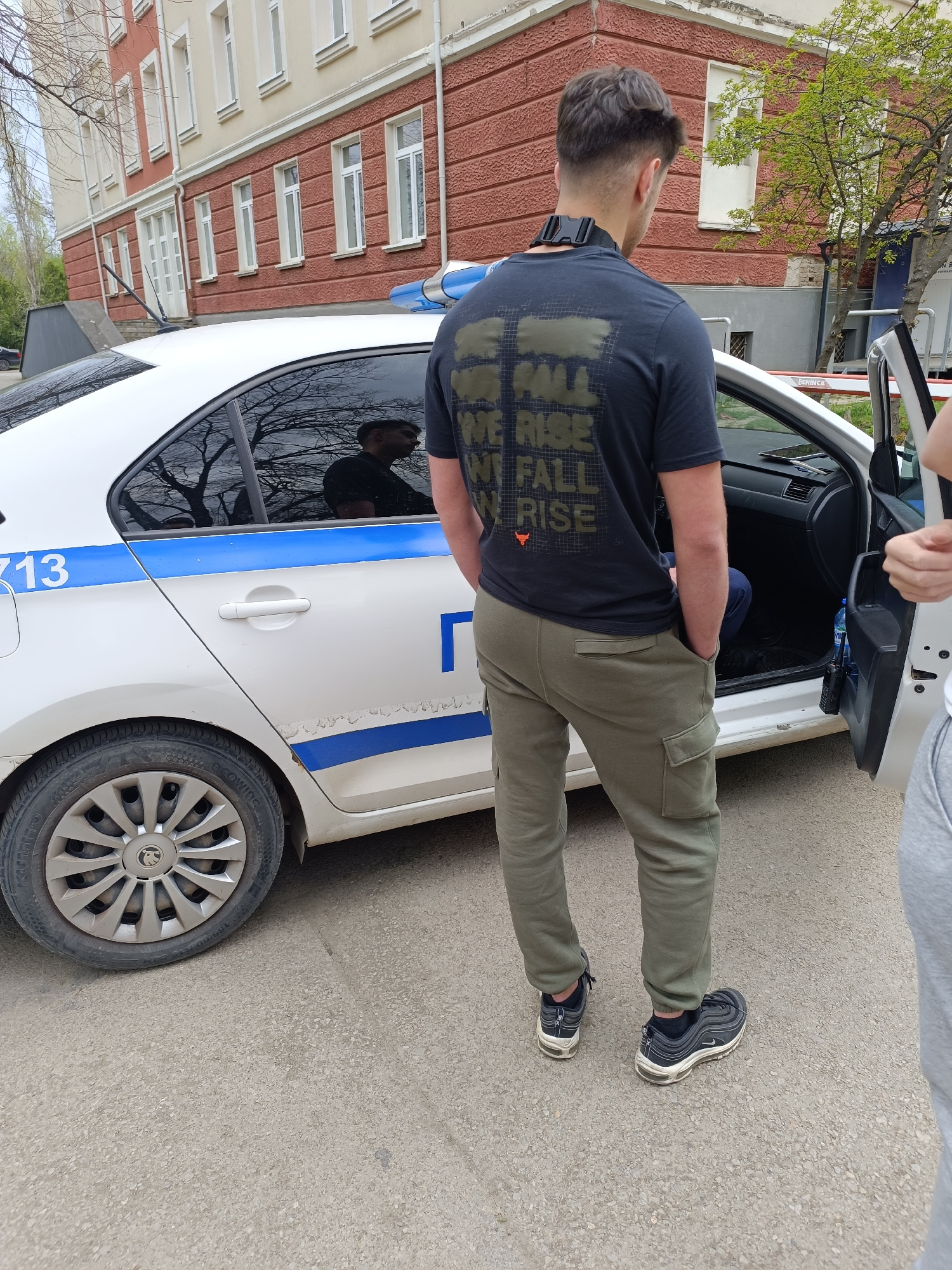 The image captures an outdoor daytime scene in what appears to be Sofia, Bulgaria. The central subject is a man viewed from behind, standing beside the open rear door of a white police car. The car fe…read more