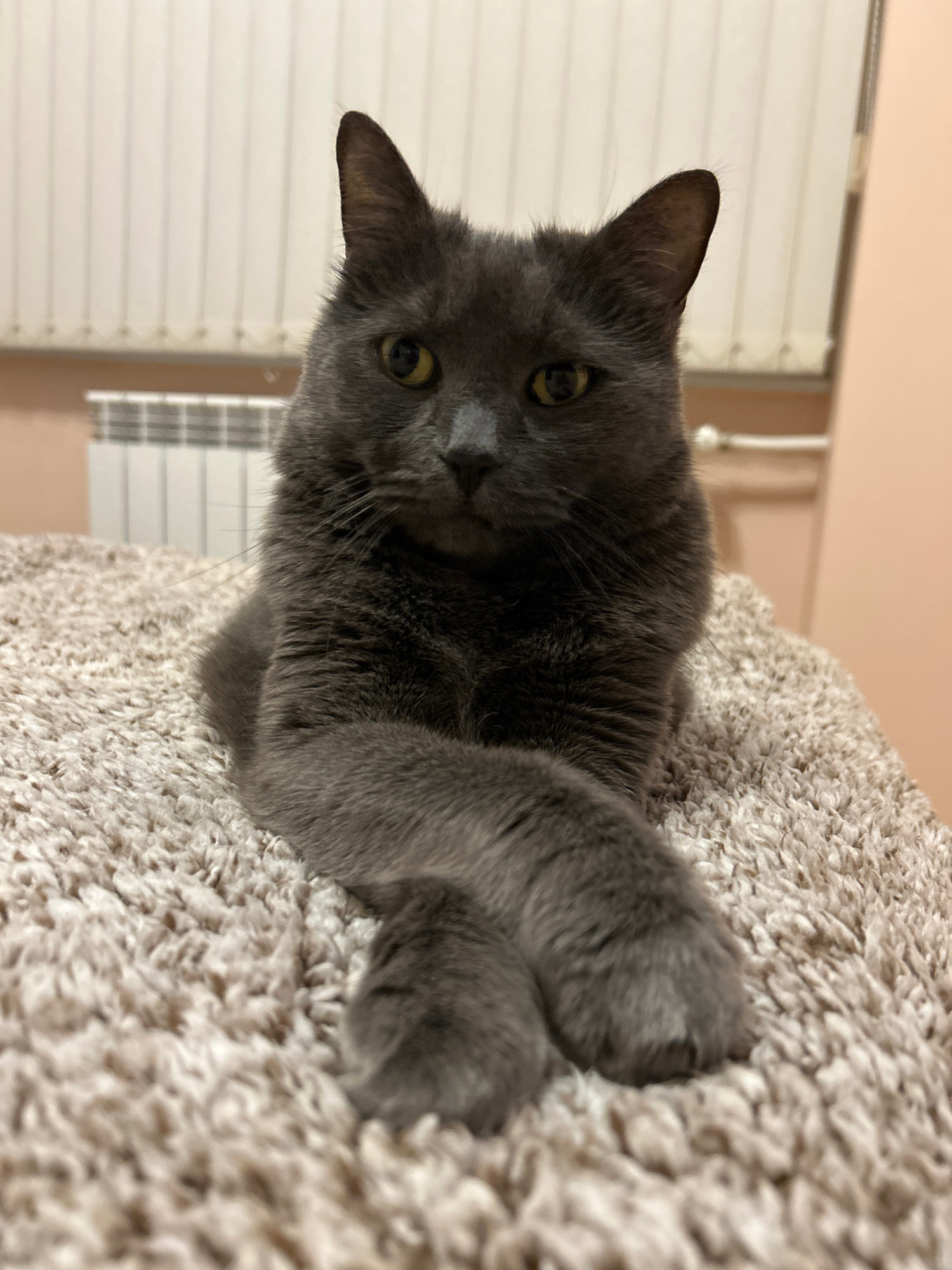 A grey cat with yellow eyes is lying on a textured beige surface, possibly a blanket or carpet. The cat's paws are crossed. Behind the cat, a partially visible white window blind is present. The backg…read more