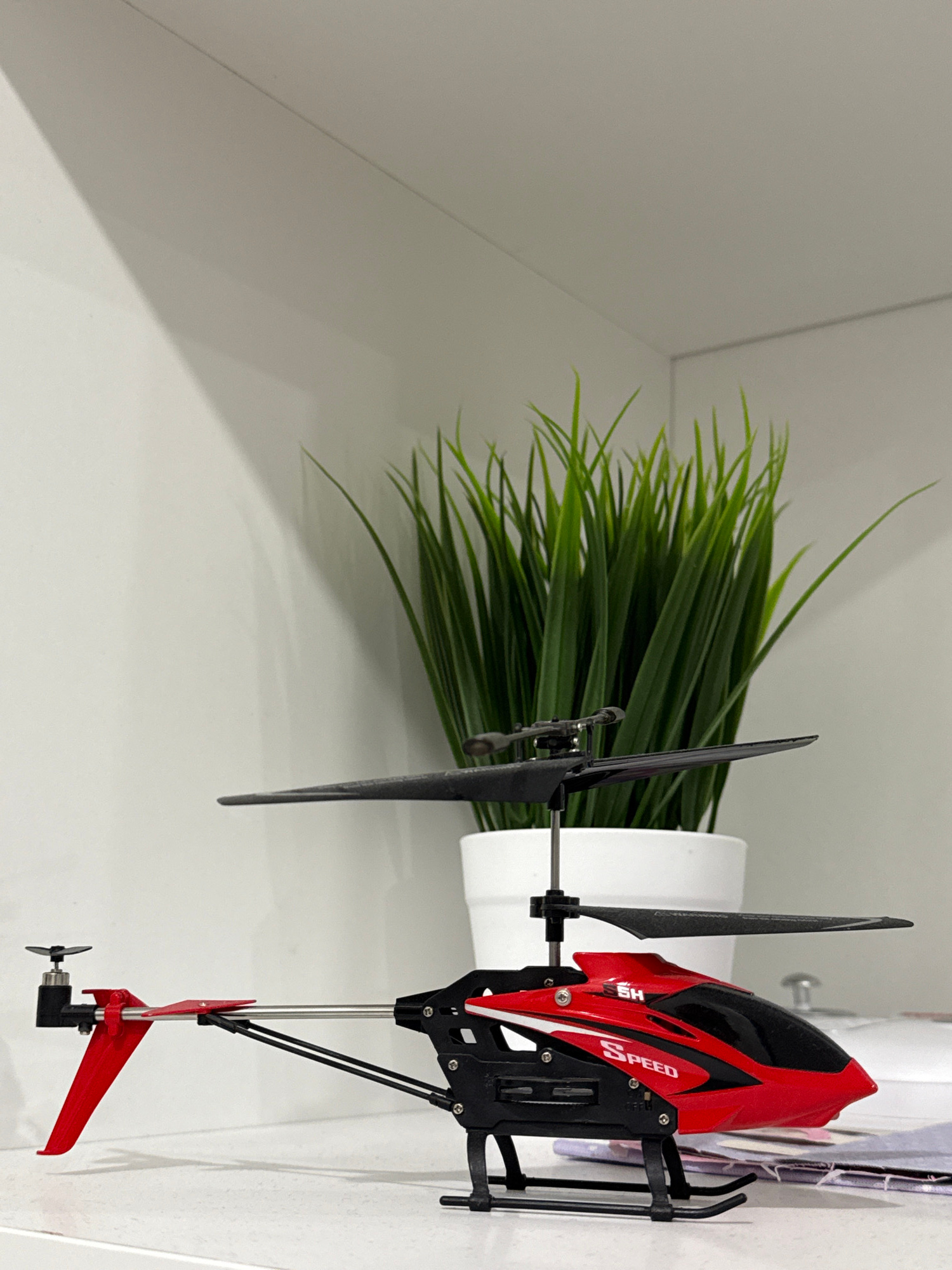 A red and black toy helicopter rests on a white surface, likely a shelf or desk, in an indoor setting. The helicopter's body is predominantly red with black details and white stripes, prominently disp…read more