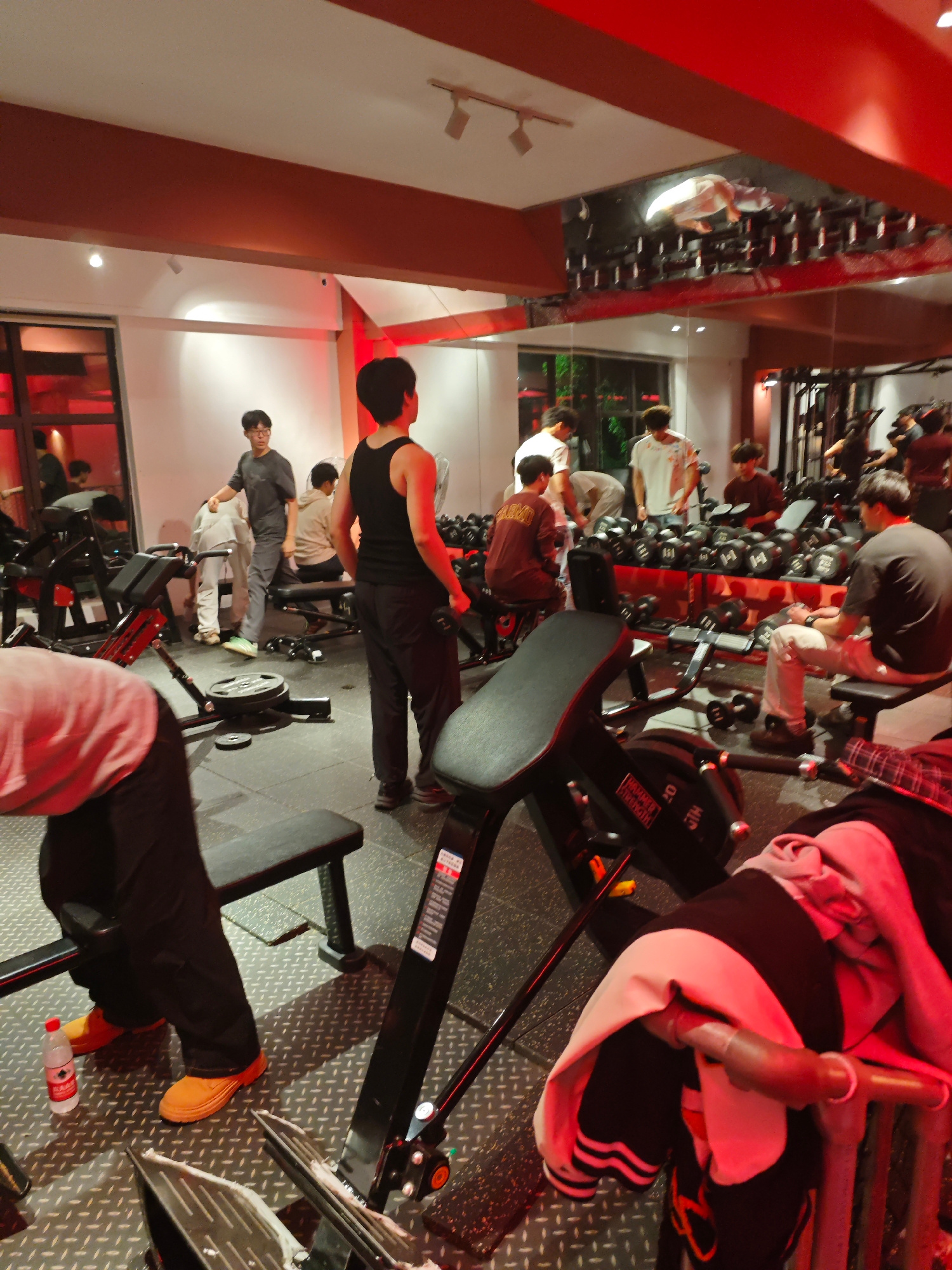The image shows a busy gym interior in Chongqing High-tech Zone, China. Several people are engaged in various exercises. There are multiple weight benches and dumbbell racks. One man is standing in a…read more