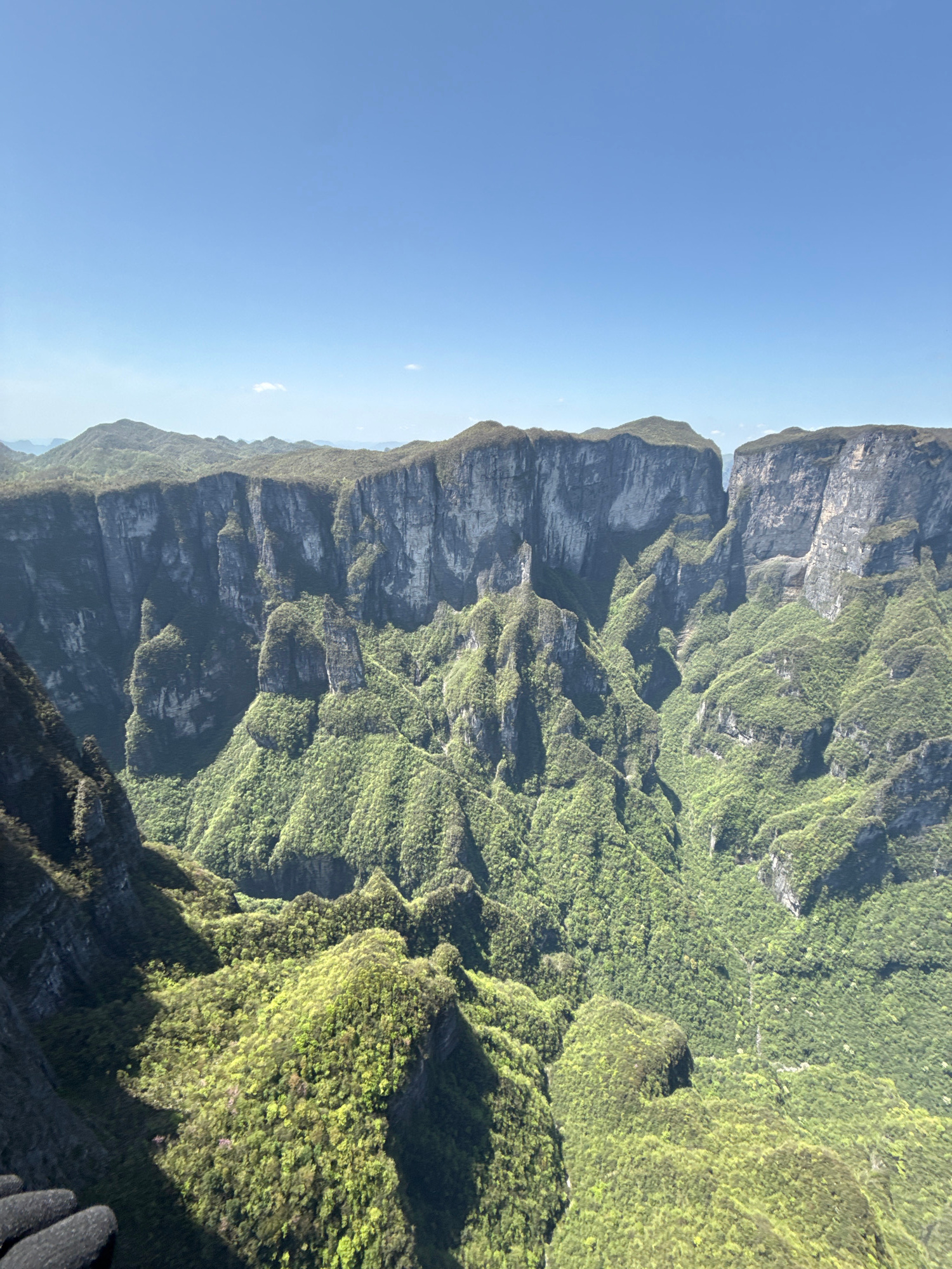An eye-level, vertical shot captures a mountain range in Yongding District, China. The clear, light blue sky fills the left side. The landscape is characterized by steep, gray rock formations and lush…read more