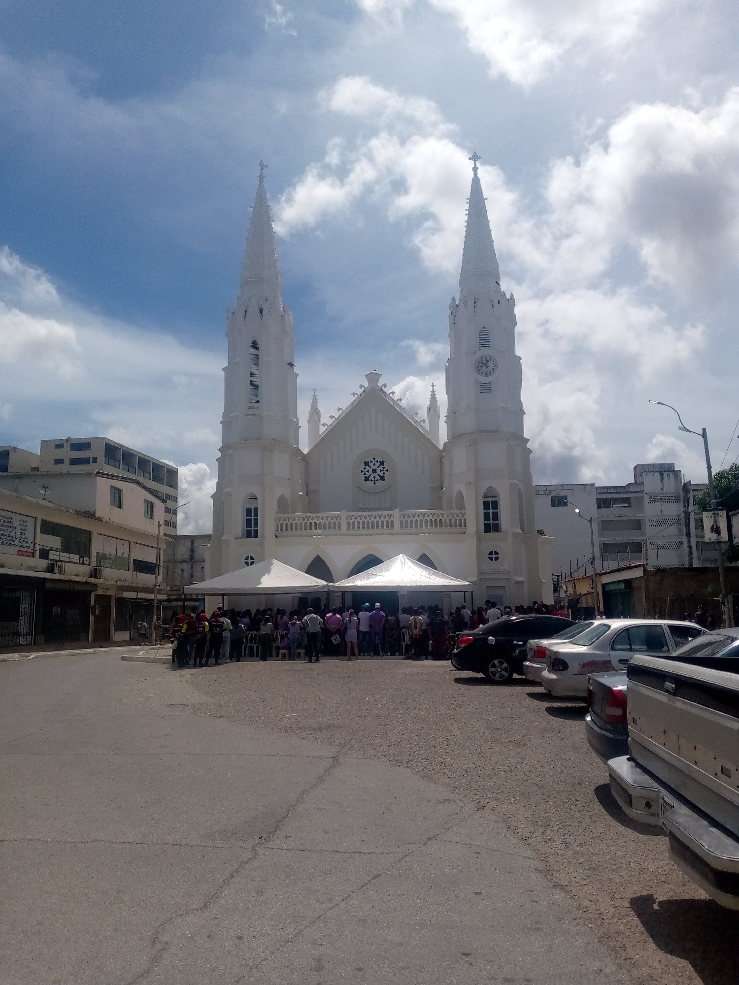 The image shows the Iglesia San Juan Evangelista in Juan Griego, Venezuela. The white church with two tall spires dominates the scene, with a small crowd gathered under a white tent in front of the enβ¦read more
