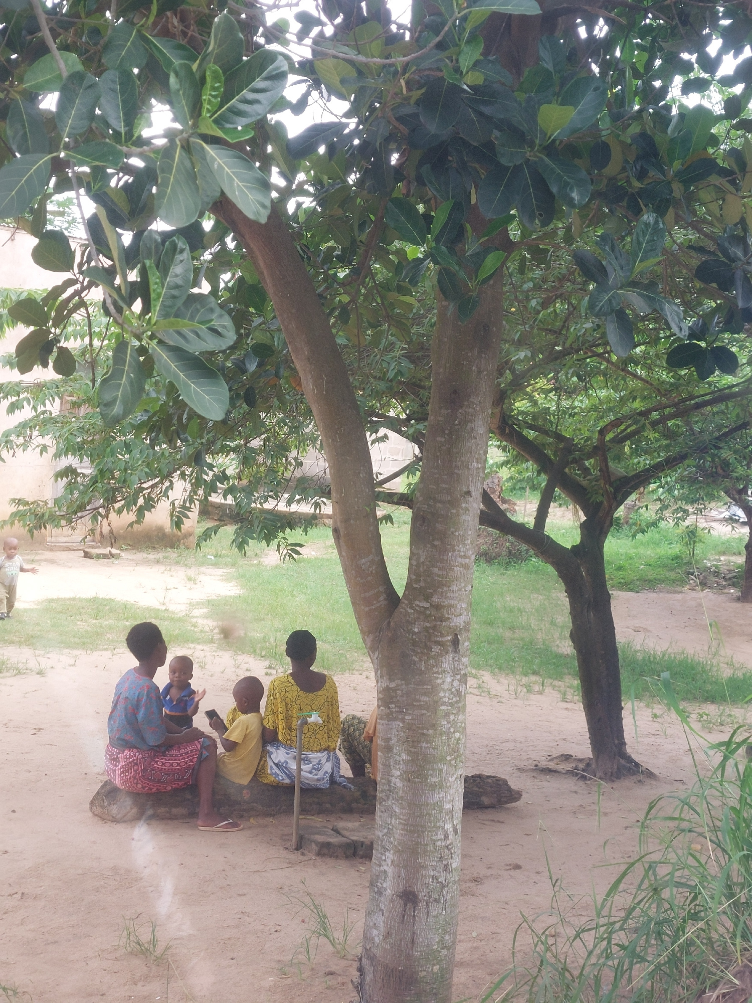 A group of four people (three adults and one child) sit together on a long, horizontal tree trunk. The group is outdoors. One adult is wearing a yellow patterned shirt, another a blue patterned shirt…read more