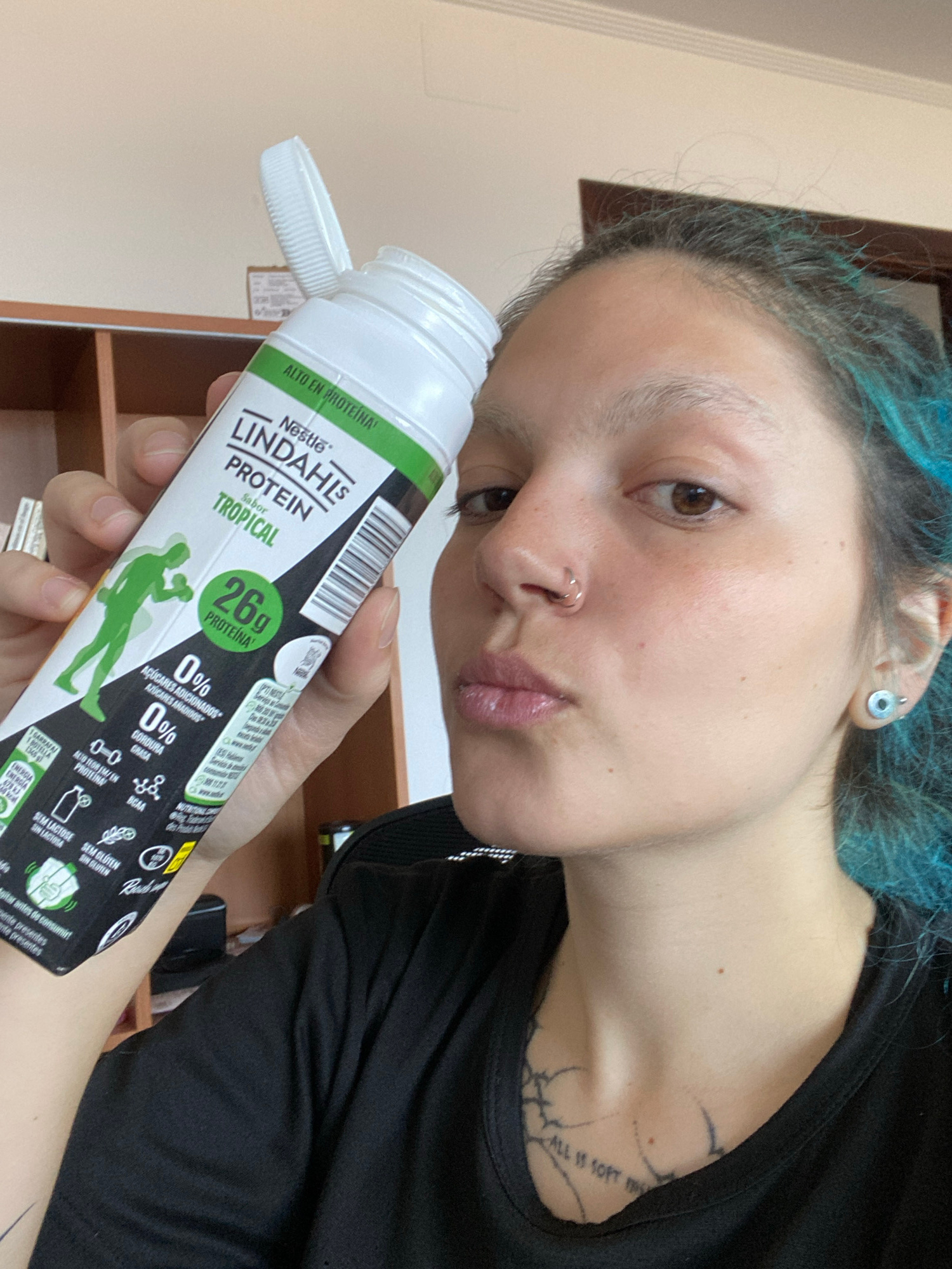 A young person with blue hair is holding a bottle of Nestlé Lindahls Protein Tropical drink. The bottle is white with green and black text and graphics. The person has a nose piercing and is wearing a…read more