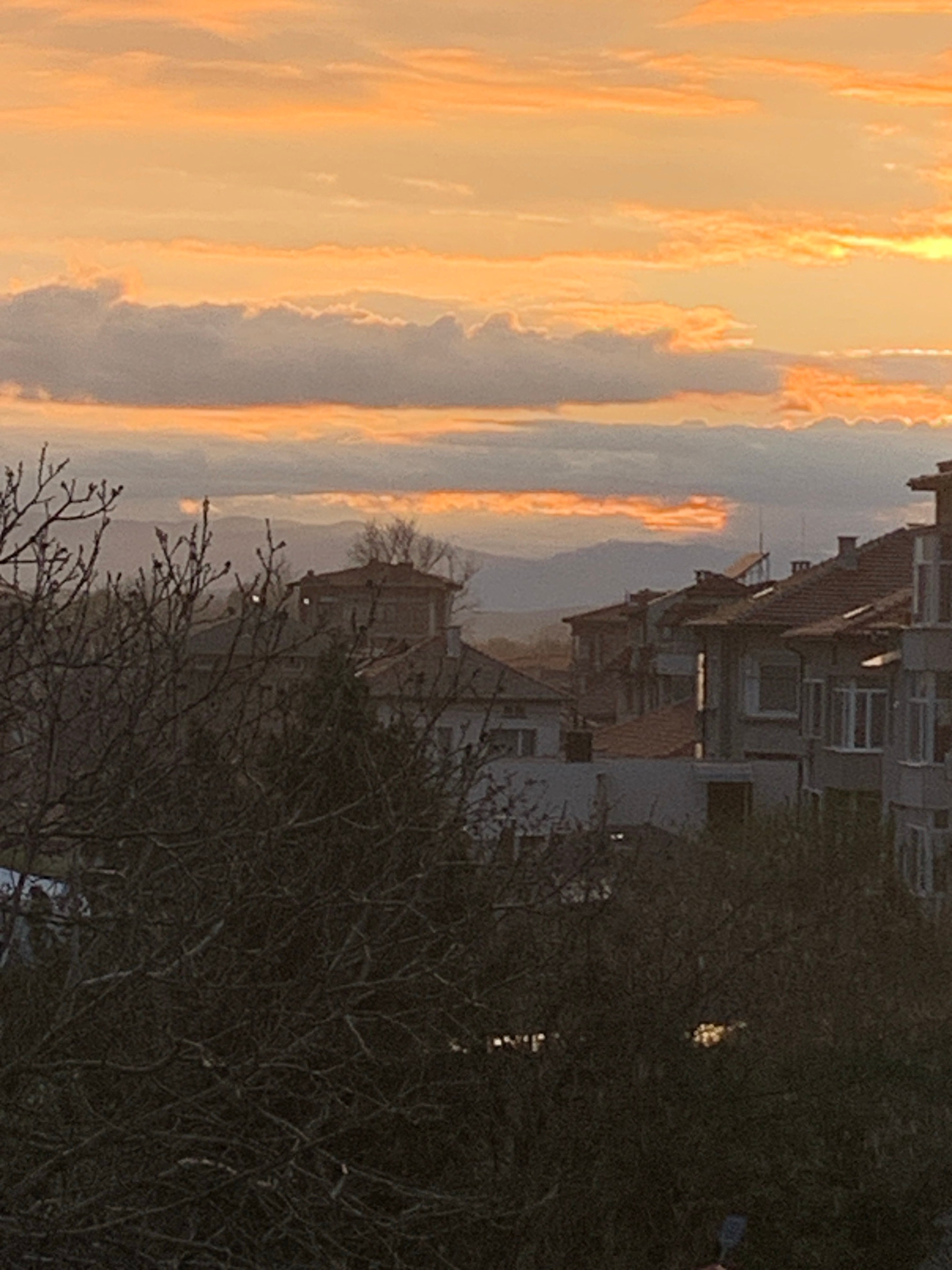 The image shows a landscape in Plovdiv, Bulgaria at dusk or dawn, as evidenced by the sky's orange and grey hues. Residential buildings, likely apartment blocks, are visible behind a bare tree. The ar…read more