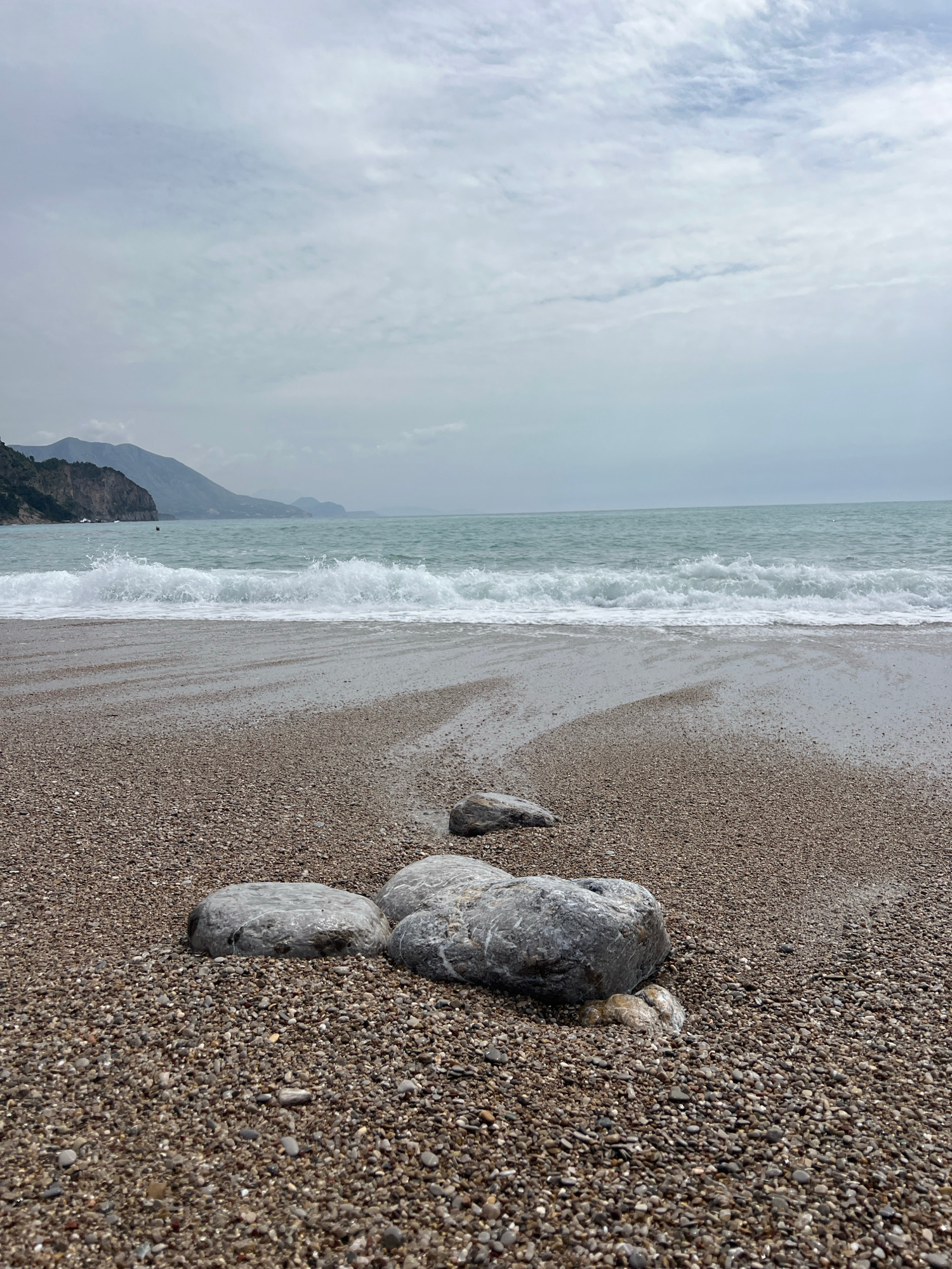 The image depicts a pebble beach on a coastline, likely near Prijevor, Montenegro, given the prompt. The sky is overcast. The sea has gentle waves breaking along the shore. In the foreground, several…read more
