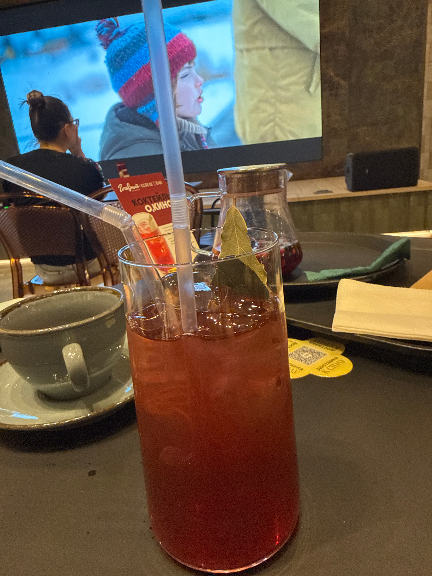 The image shows a scene in Yekaterinburg, Russia, depicting a table at a restaurant or cafe. On the table is a large, cylindrical glass containing a red beverage, likely a cocktail. It has straws and…read more