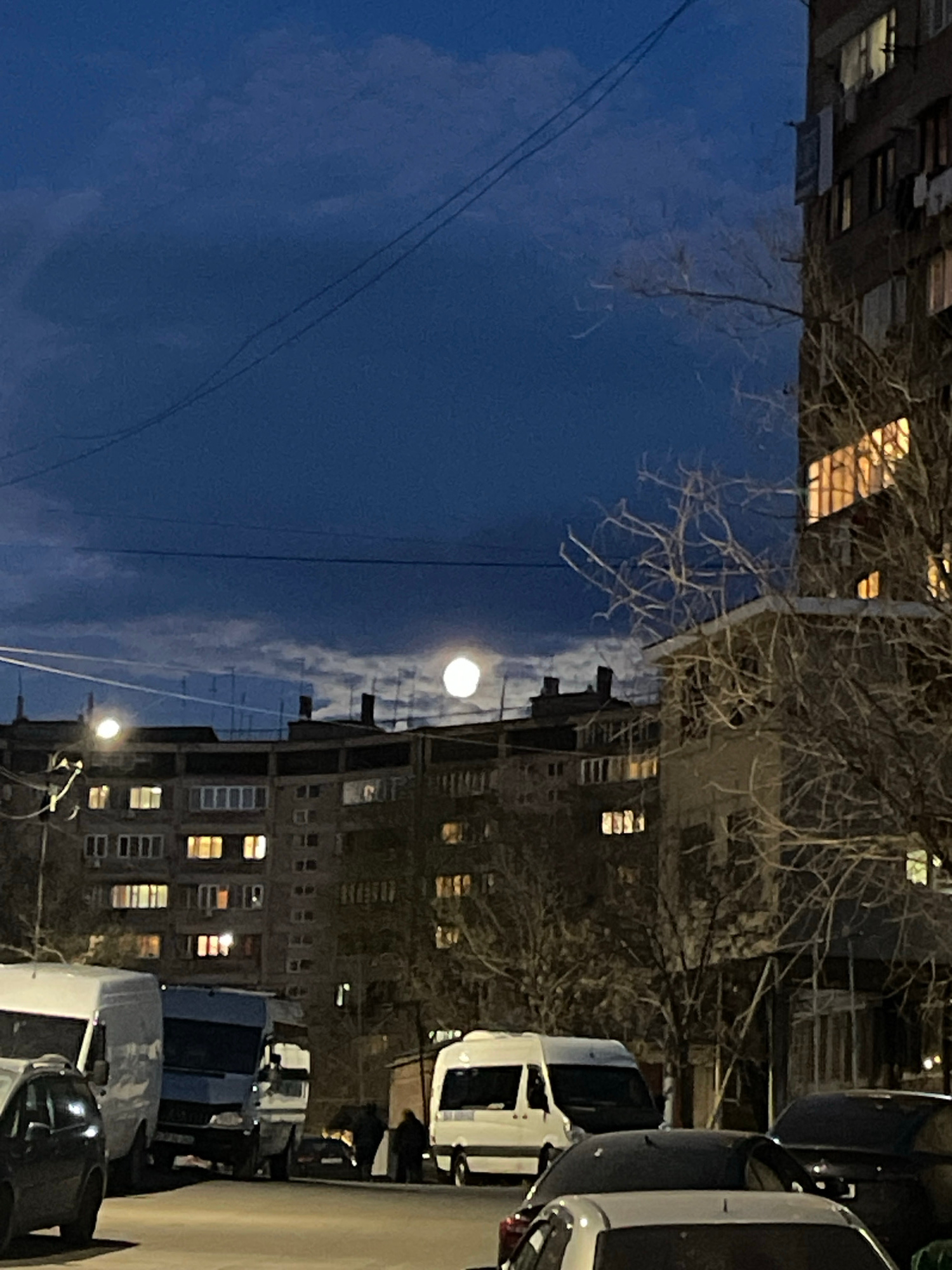 The image shows a Yerevan street scene at night. Apartment buildings with lit windows line the street. In the sky is the moon. Bare tree branches are visible. Several cars and vans are parked along th…read more