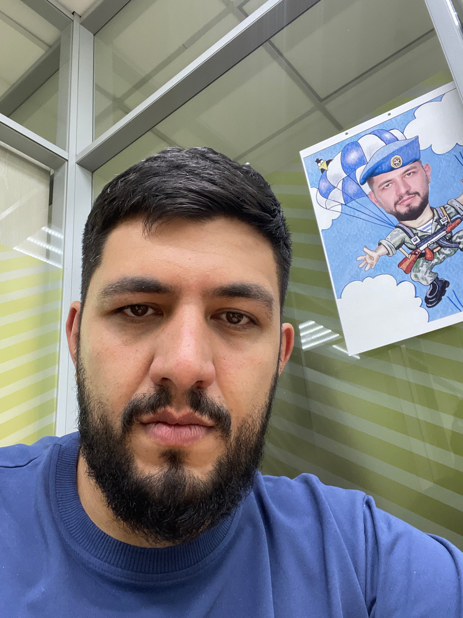 A close-up, indoor selfie features a man with dark hair and a beard, wearing a blue sweater. Above and slightly behind him is a cartoon drawing pinned to the wall. The cartoon depicts a man resembling…read more