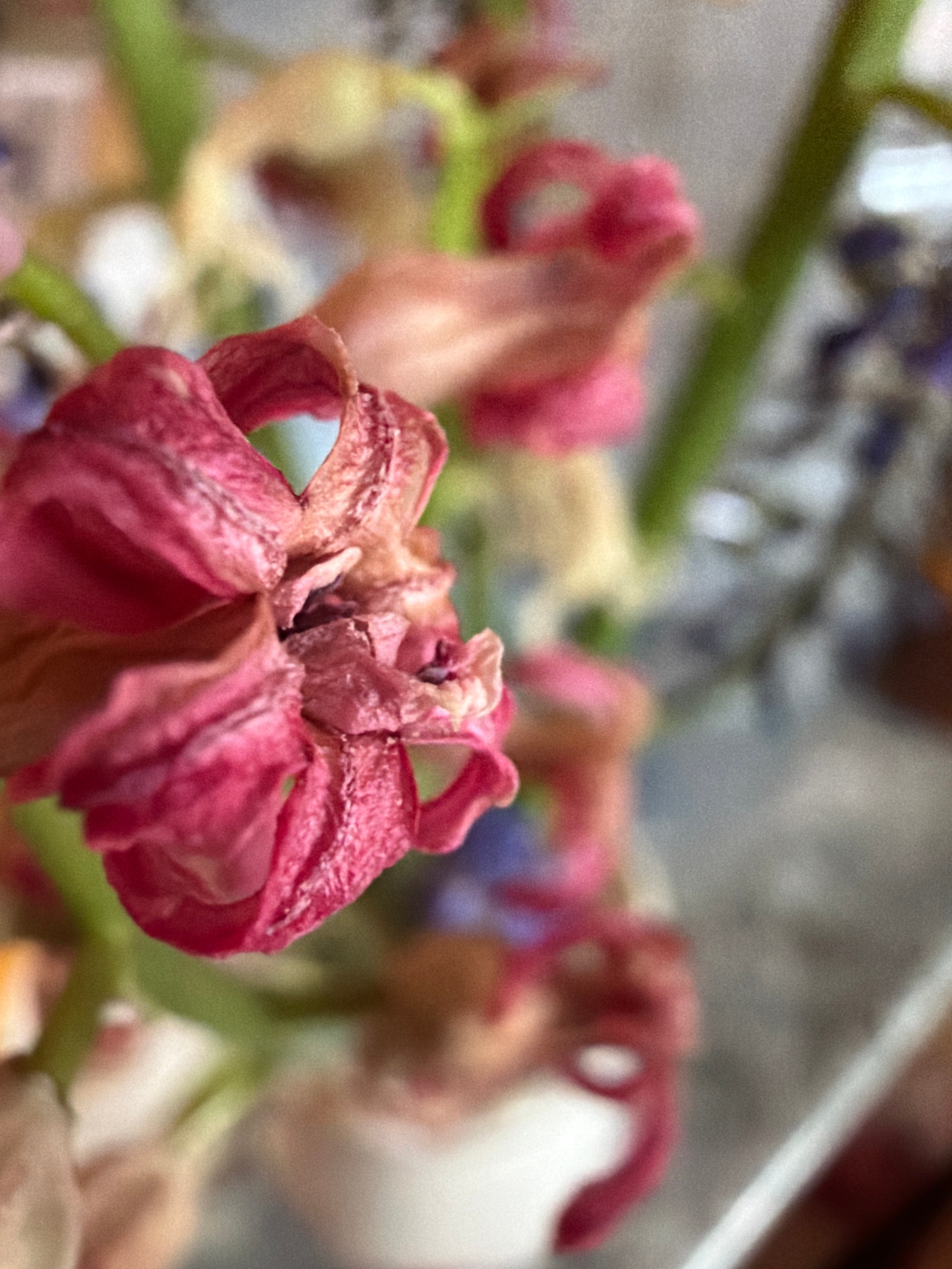 A close-up photograph features a wilting, reddish-pink flower as the primary subject. The flower is noticeably drying out, with its petals curling and exhibiting a withered texture. Other flowers, als…read more