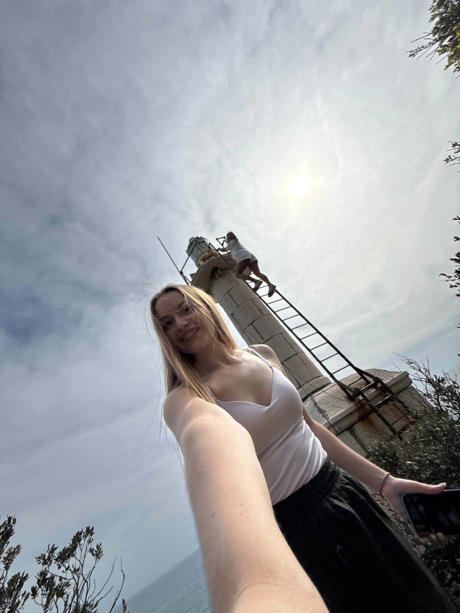 A selfie image shows a woman with blonde hair, wearing a white tank top and dark shorts, holding a phone and looking at the camera. The perspective is from below, looking up at the woman and beyond he…read more