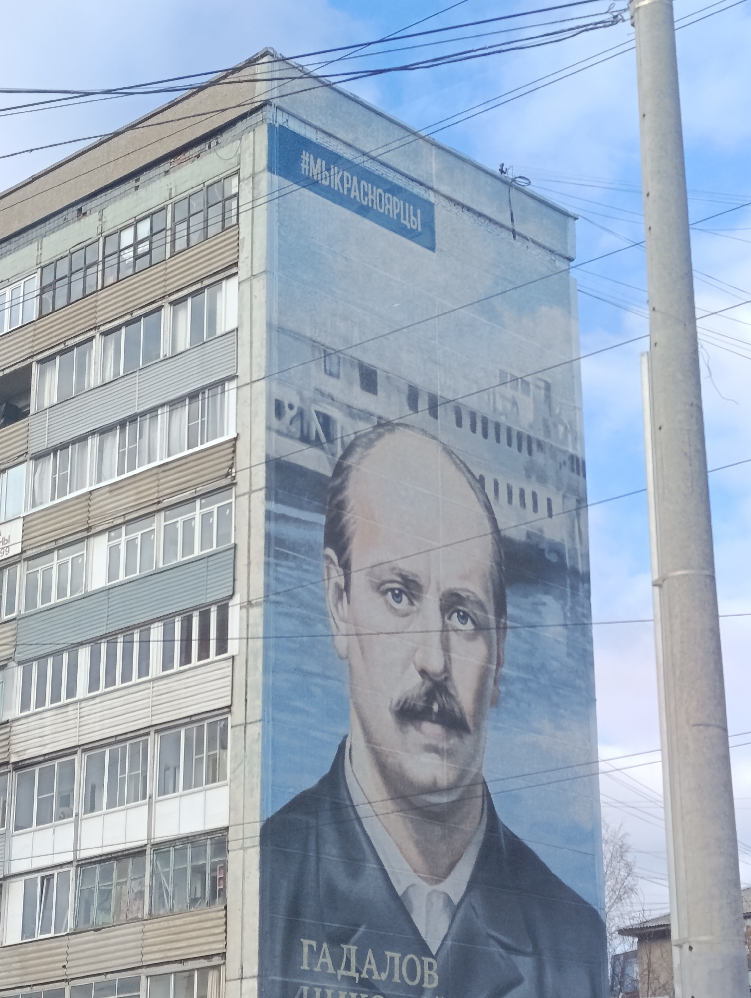 This image displays a large mural painted on the side of a multi-story apartment building in what appears to be an urban environment, likely Krasnoyarsk, Russia, given the contextual information and v…read more