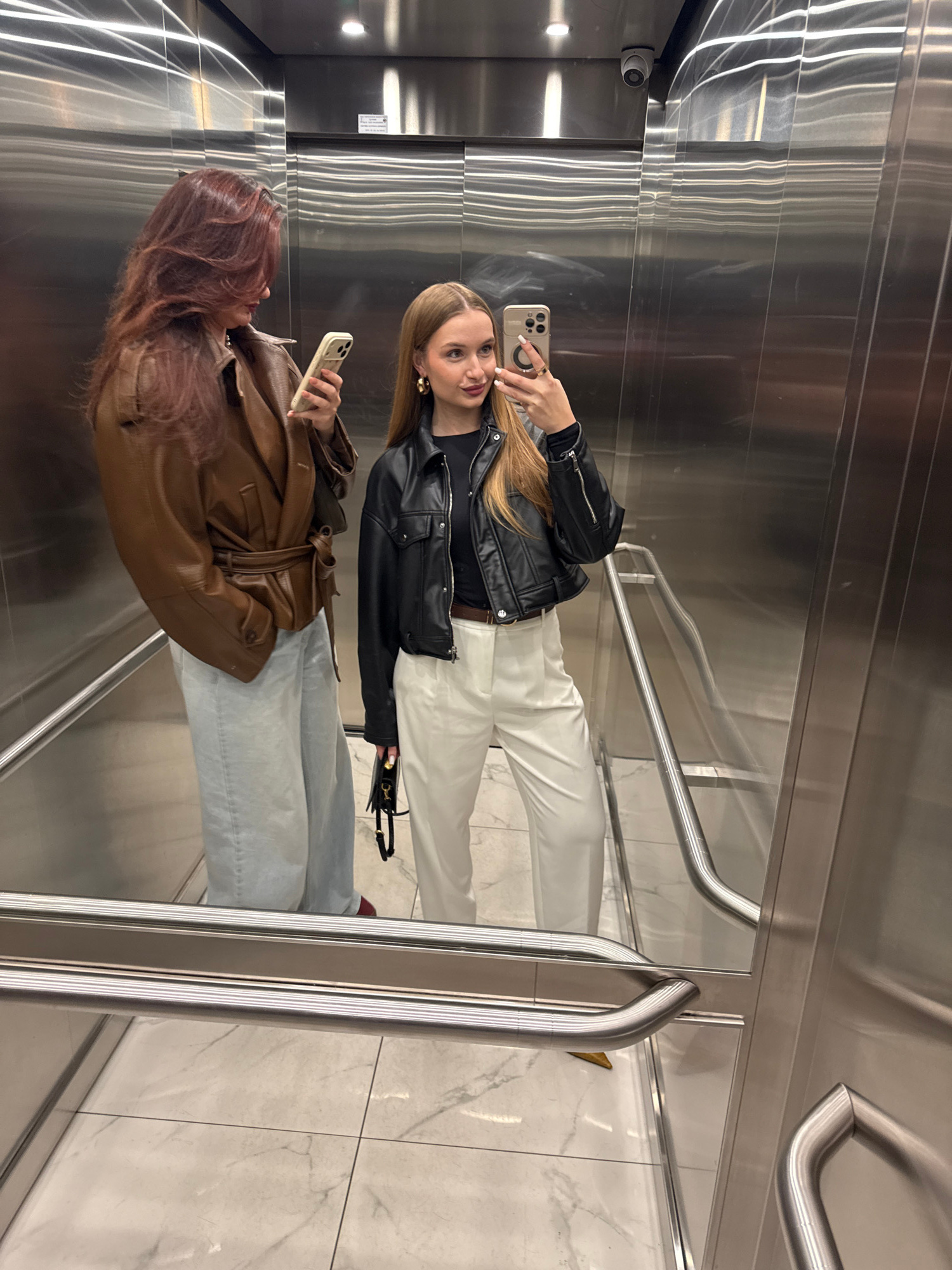 Two women stand in an elevator, as reflected in the mirrored wall. The woman at the top of the frame is blonde and wears a black leather jacket, white pants, and black shoes. She holds a phone in her…read more