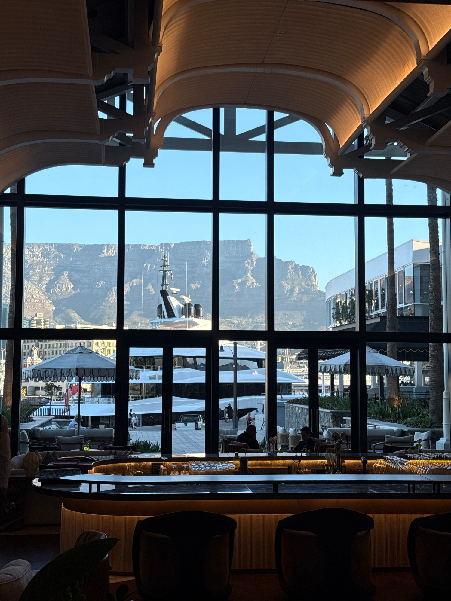 The image shows an interior view through a large window with a grid pattern. Outside, Table Mountain dominates the skyline. In the foreground, a bar area is visible with chairs and tables, suggesting…read more