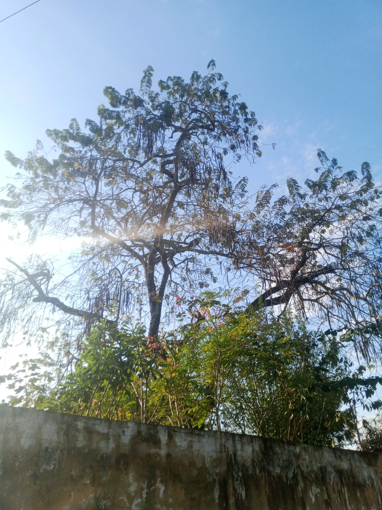 The image captures a view from Caño de Indio, Venezuela, looking upwards towards a large tree with sparse foliage and long, hanging seed pods. The tree stands behind a low, weathered concrete wall, wi…read more